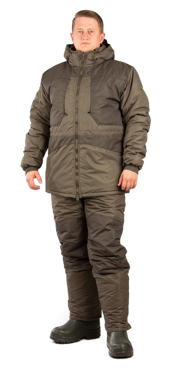 Удлиненная куртка прямого силуэта с воротником-стойкой, центральной застежкой на двухзамковую молнию. Утеплитель "Русский север" сохраняет комфортную температуру. Полукомбинезон с анатомическим кроем наколенников, ширина низа брюк регулируется при помощи хлястика, предусмотрена фиксация полукомбинезона по линии талии (настрочена эластичная тесьма).