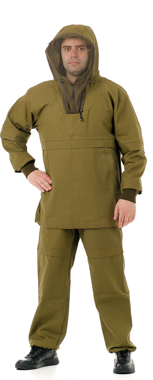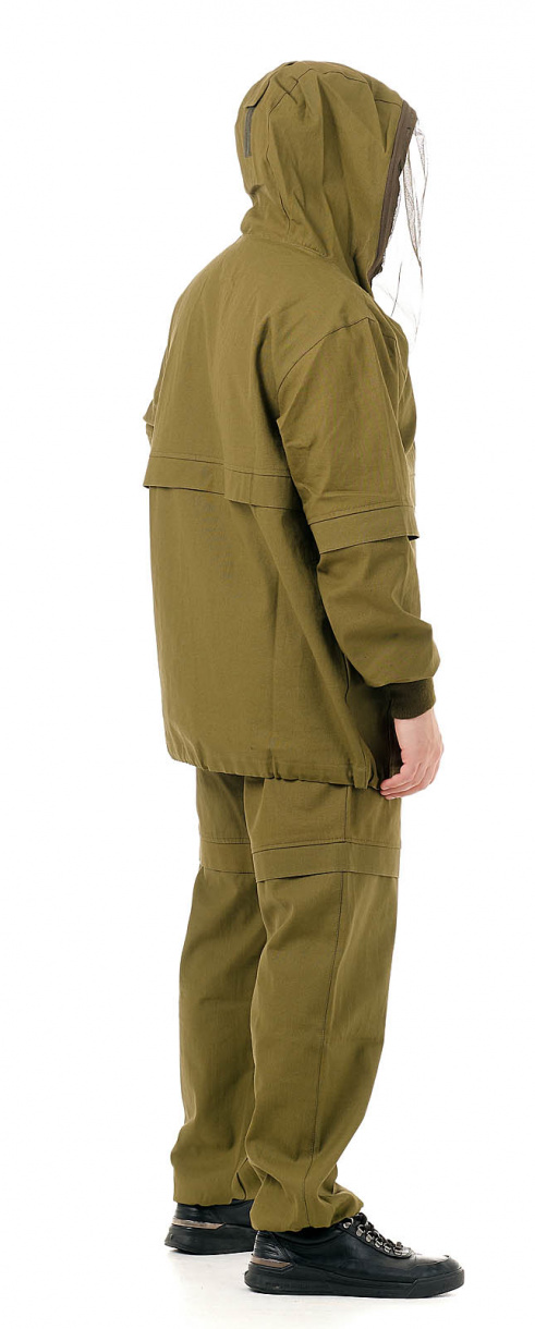 Костюм оснащен специальными ловушками для клещей – на рукавах, куртке, брюках. Сетка накомарника съемная и легко убирается в потайной карман на груди. Куртка утягивается по низу.