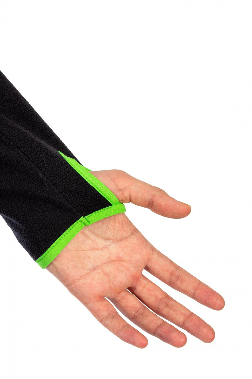 • низ рукавов окантован резинкой контрастного цвета с петлей под большой палец для фиксации рукава при надевании верхней одежды
