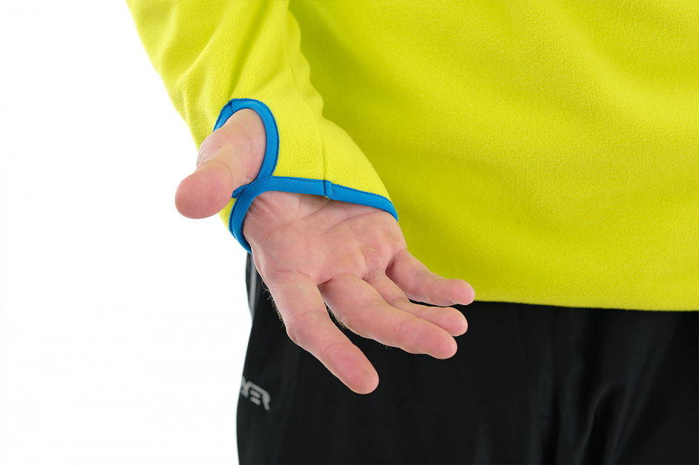 Рукава чуть длиннее обычного с отверстием под большой палец для фиксации рукава при надевании верхней одежды. Такие рукава очень удобны если холодно, их можно натянуть на палец,