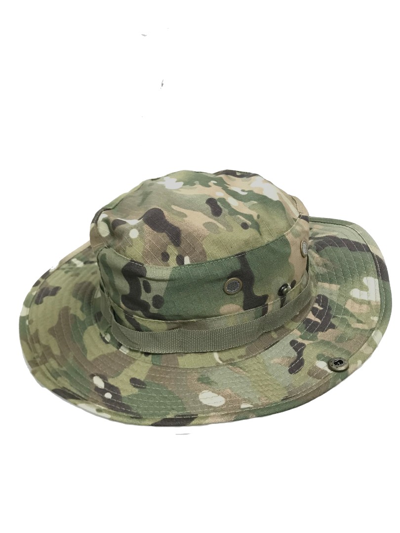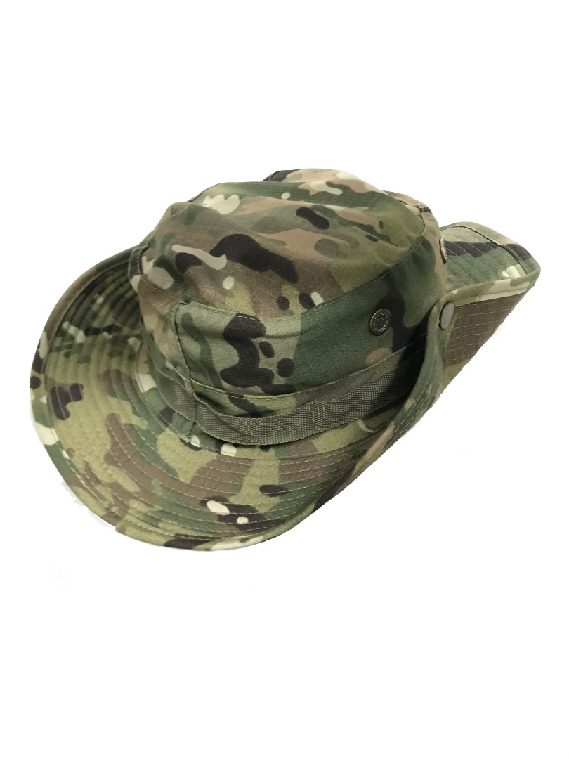 Панама c широкими полями, зеленый камуфляж. Шнуровка с регулятором фиксирует панаму на голове, по бокам распологаются металлические вентиляционные люверсы.