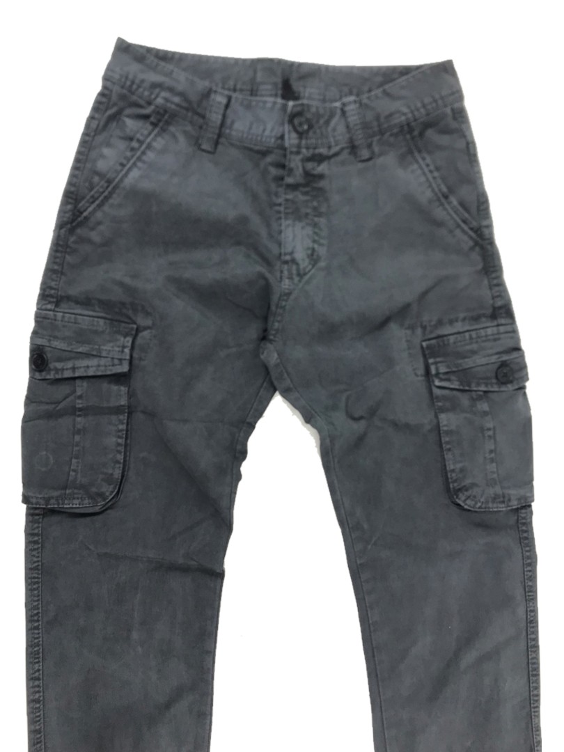 Шесть карманов: два поясных глубоких кармана, два задних вшитых кармана прикрытыx тканью, два боковых накладных кармана закрывающихся при помощи кнопок, в нижней части брюк находится находится утягивающий манжет длиной 5 см.