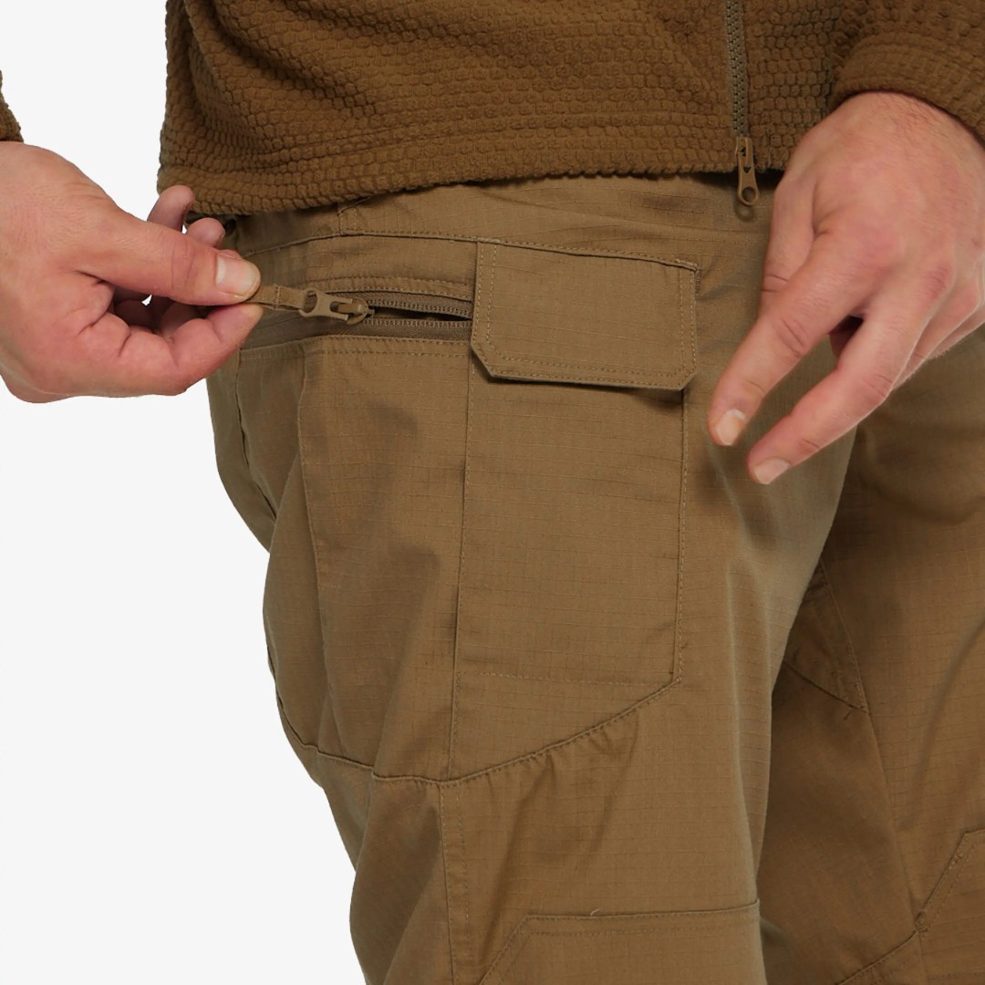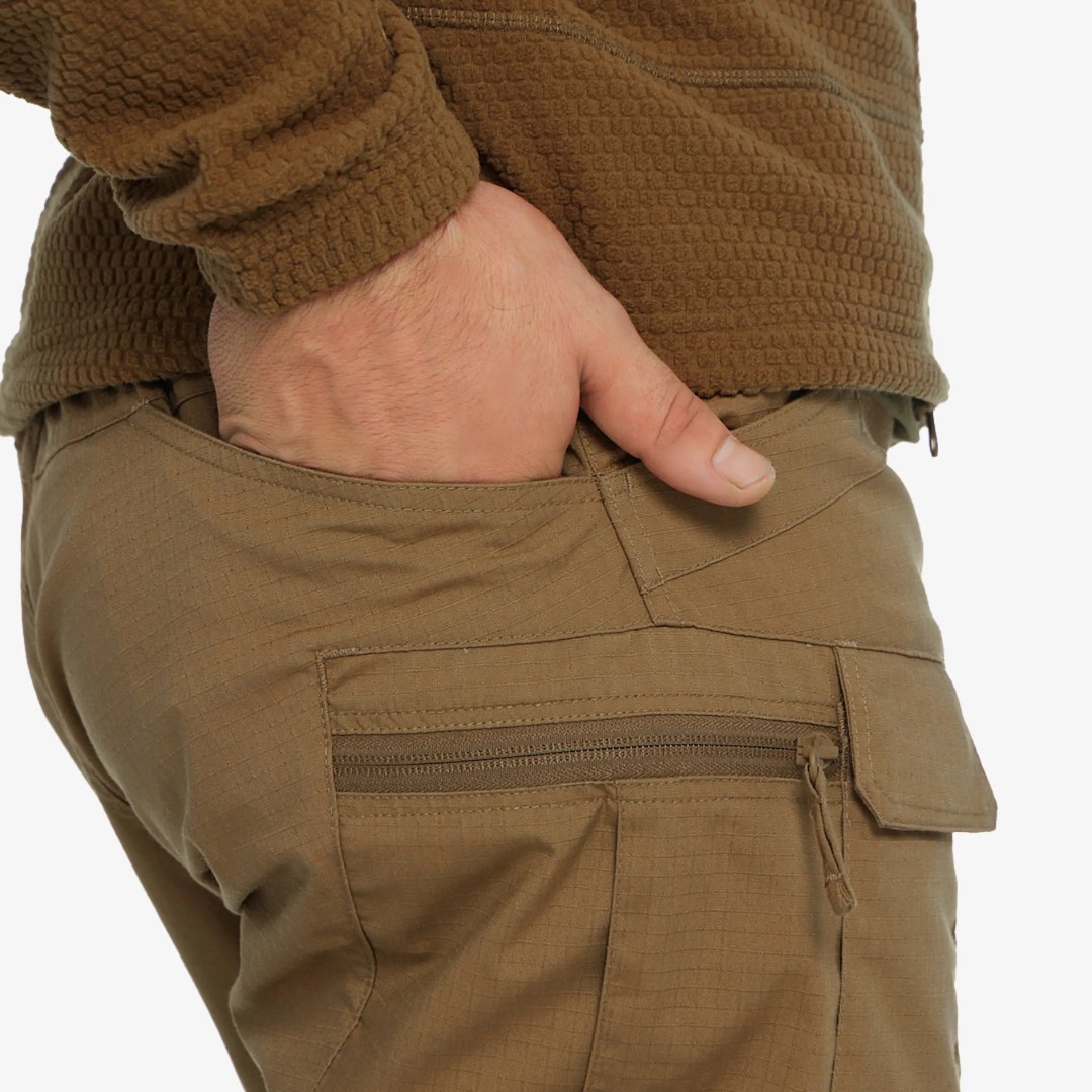 Расположение карманов позволяет распределить нагрузку вблизи центра тяжести и вокруг бедер и талии. Края карманов усилены, чтобы выдерживать постоянное скольжение зажимов для фонарей и ножей.