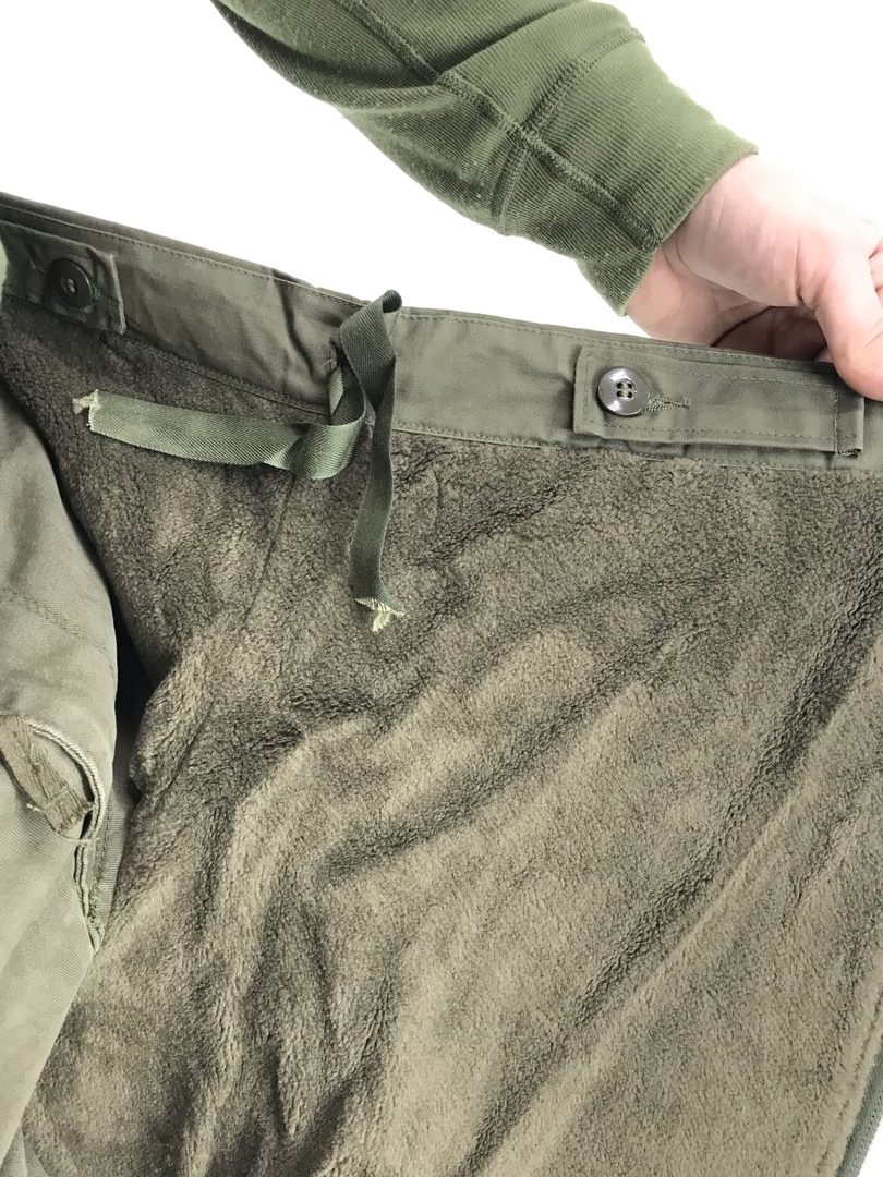Непромокаемый внешний материал.Искуственный мех внутри.В поясе вшита шнуровка для утяжки.В нижней части брюк по бокам нашита усиленная плотная ткань для меньшего истирания ткани.
