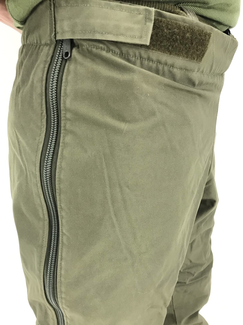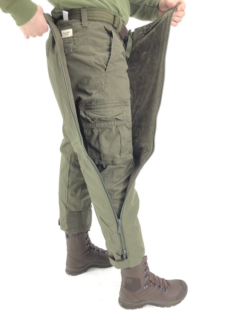 Молнии по бокам брючин от низа до пояса,благодаря которым их можно одевать и снимать не снимая обуви.По бокам утяжка на липучке.Пуговицы для подтяжек BW