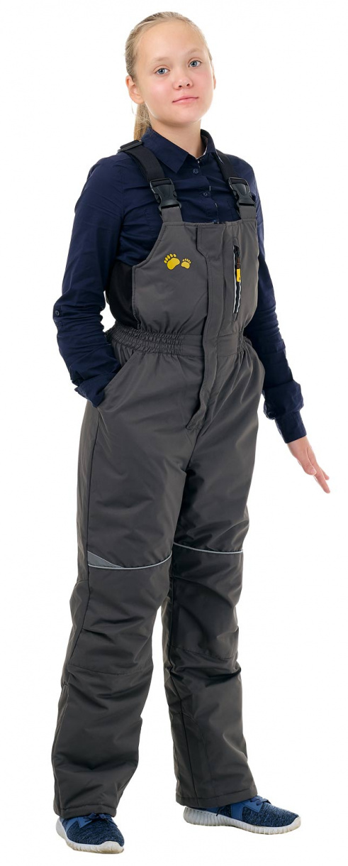 Высокие брюки-полукомбинезон «Мегаполис» (ТМ МАУГЛИ) анатомического кроя на эластичных регулируемых лямках. Застежка-молния с двумя бегунками и ветрозащитной планкой на липучке. Пояс собран на широкую простроченную эластичную ленту. Один нагрудный карман на молнии и два кармана у пояса.