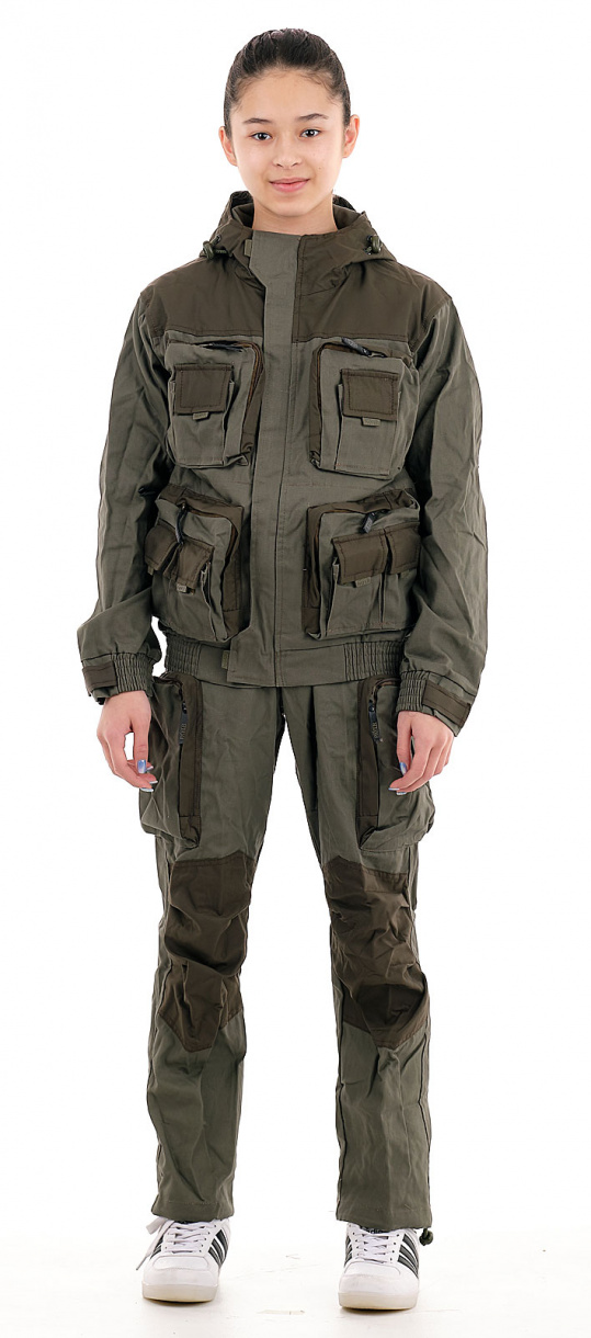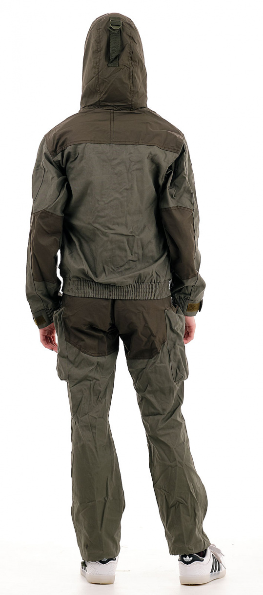 Состоит костюм из укороченной куртки и полукомбинезона. Анатомический крой позволяет легко и свободно двигаться. Куртка, благодаря обработке на поясной машинке, плотно прилегает по бедрам, не пропуская ни мошку, ни ветер. Бретели позволяют отрегулировать полукомбинезон по фигуре. В более теплую погоду спинку полукомбинезона можно отстегнуть.