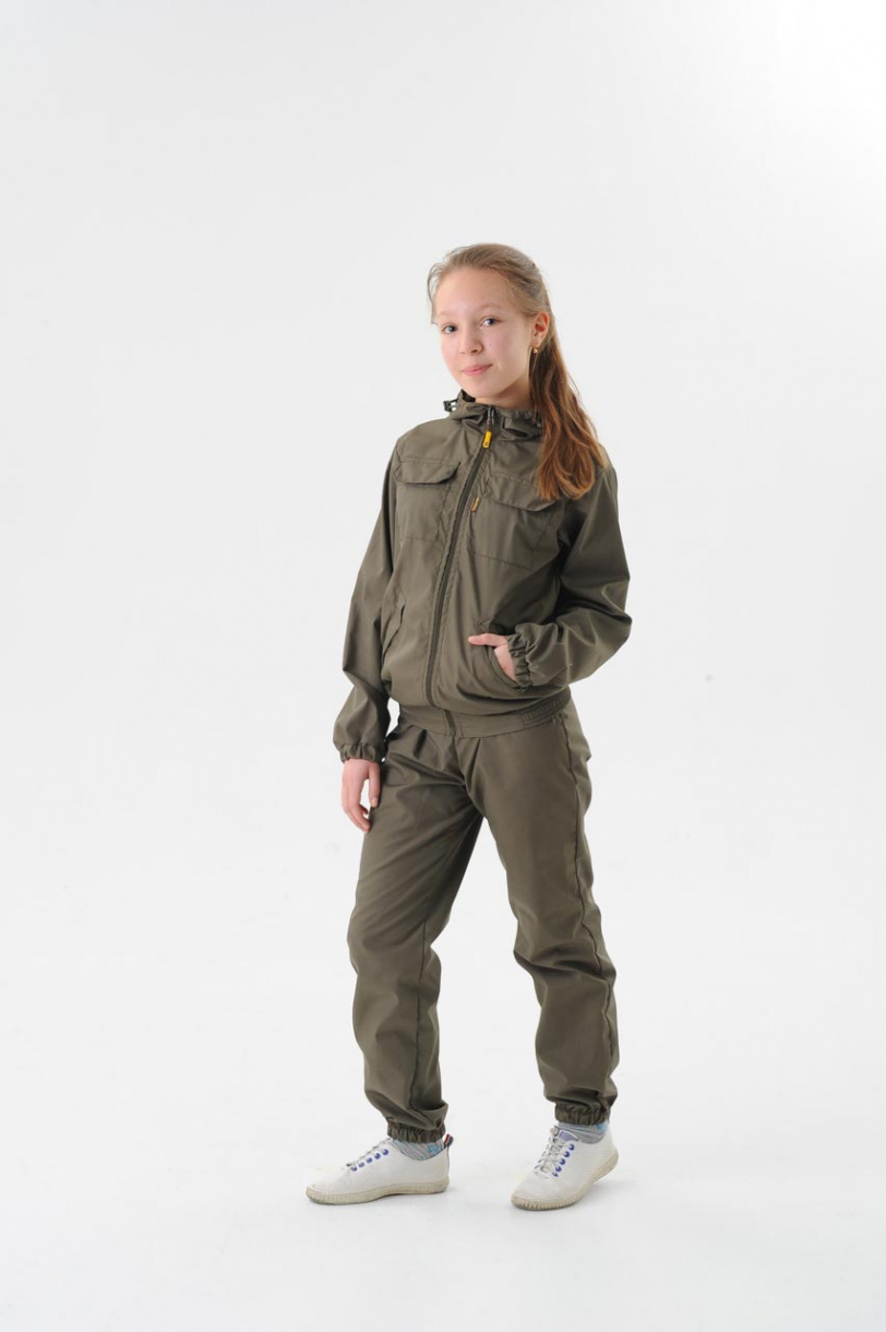 Низ укороченной куртки собран на широкую простроченную резинку. Капюшон регулируется по овалу лица. Два нагрудных кармана закрываются на клапаны с липучками, два нижних кармана с двойными листочками без застежки. Низ брюк и рукавов на резинке.