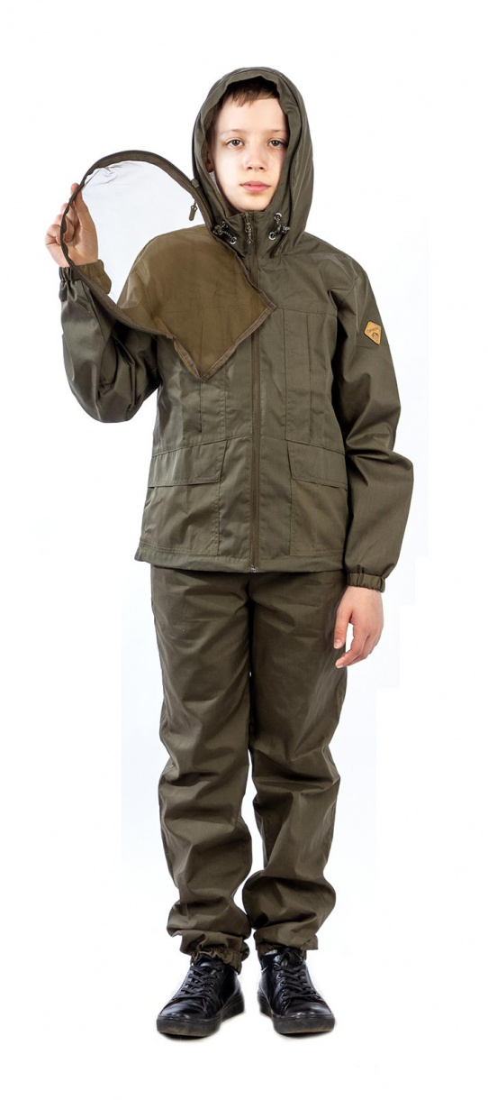 Удлиненная куртка по низу регулируется утяжками. Рукава куртки с манжетами плотно облегают руки, препятствуя проникновению насекомых. Капюшон регулируется по овалу лица шнуром. Антимоскитная сетка пристегивается к капюшону молнией и легко убирается в небольшой кармашек на груди. Широкие листочки четырех вместительных карманов защитят от попадания лесного сора.