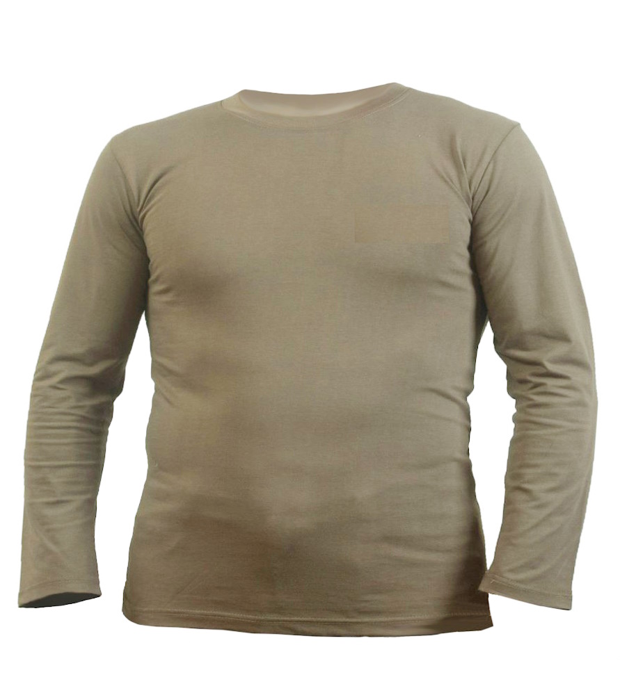 Уставная футболка с длинным рукавом в цвете хаки. Выполнена из хлопкового материала, дышащая ткань приятно облегает тело. Может использоваться как термобельё 1 слоя или как отдельная кофта для повседневного использования.