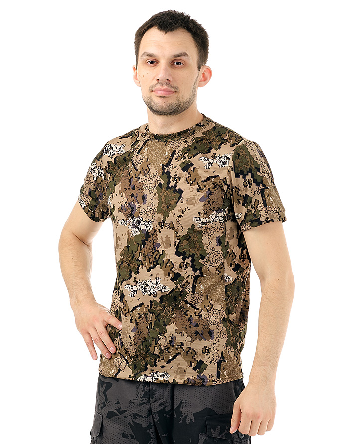 Мужская трикотажная футболка прямого кроя с круглой горловиной выполнена из 100% полиэстера. Рекомендуется бережная стирка при 40 градусах.