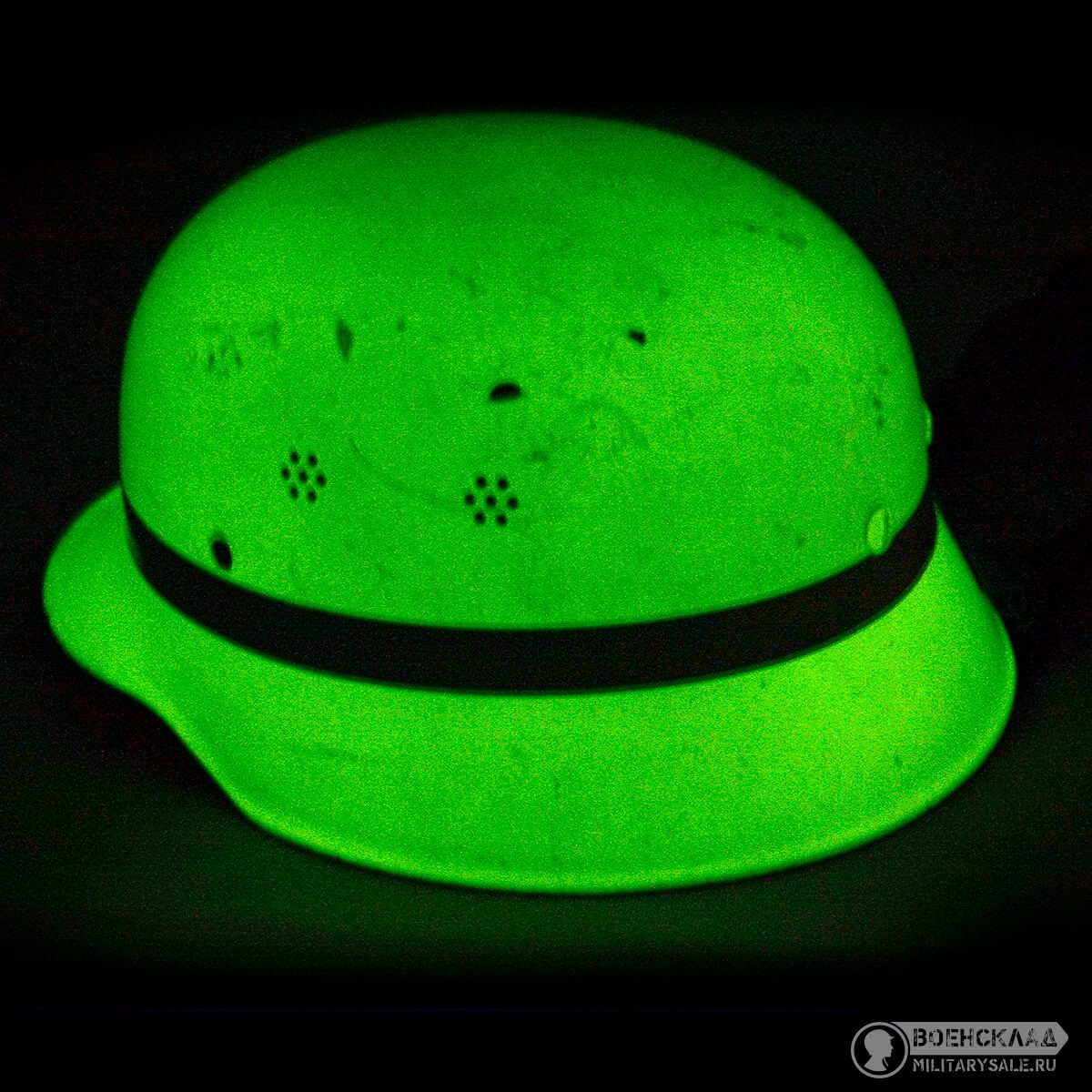 Фосфоресцирующее покрытие желтоватого цвета , набирает свет и в темноте светится со светоотражающей полосой вокруг.