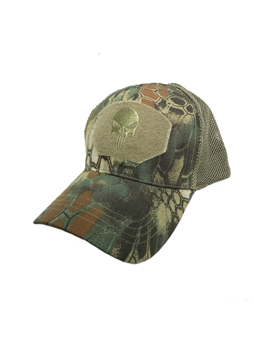 Кепка в камуфляже с эмблемой и липучкой велкро спереди. Часть кепки состоит из сетки, размер регулируется с помощью липучки велкро