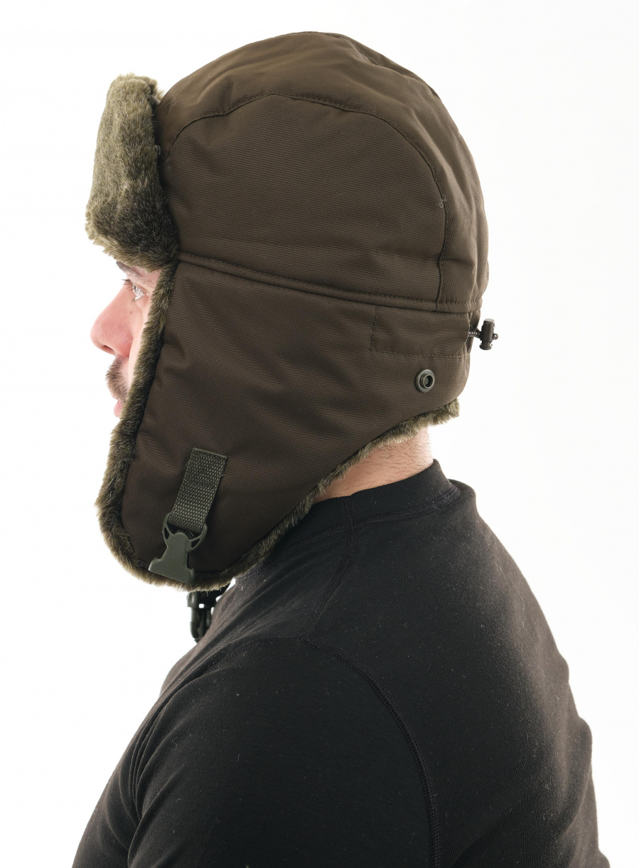 Шапка выполнена из мембранных материалов и утеплена фирменным утеплителем Русский север. Различные варианты фиксации "ушей" шапки для максимально удобного использования.