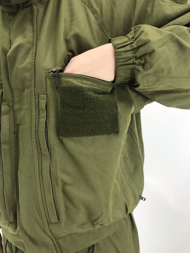 На куртке четыре кармана,2 нагрудных на молнии,2 кармана по бокам.Воротник лежачий,при необходимости может делать в стойку,при помощи крепления велкро.Утяжка-резинка сзади,в районе спины и в нижней части куртки.Рукав утянут вшитой резинкой регулируется с помощью липучки велкро,имеется молния для удобного снятия.