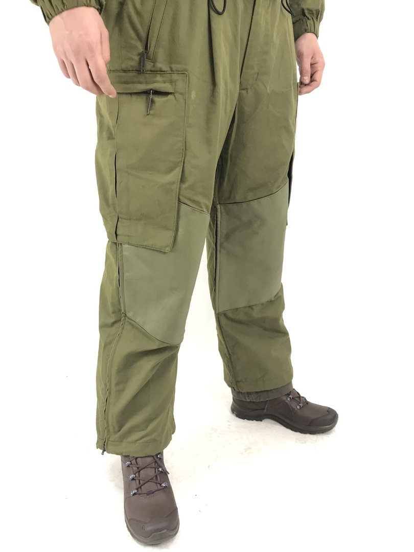 На штанах имеется утяжка-резинка с клапанами,пуговицы для крепления подтяжек BW.Застёжка молния.Колени усилены резиновым материалом и обладают хорошей износоустойчивостью .В нижней части брюк расположена молния,которая позволяет быстро снимать при одетой обуви.В манжет брюк вшита резинка,которая регулируется с помощью клапана.