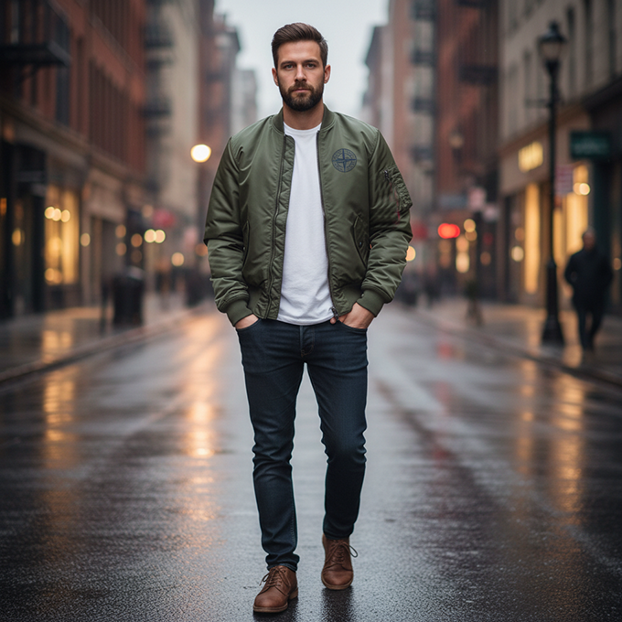 Лаконичный дизайн позволяет легко сочетать бомбер с разной одеждой — от casual-образов до более строгого городского стиля.