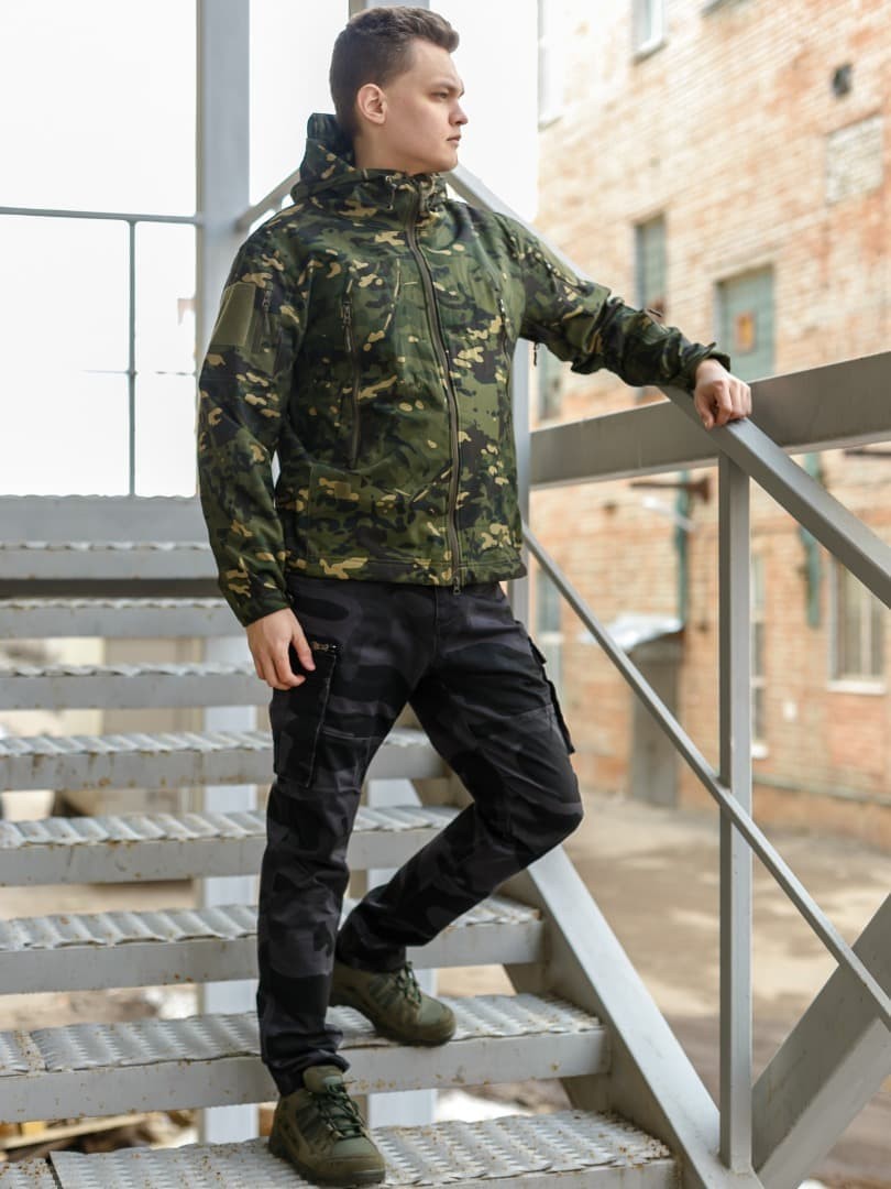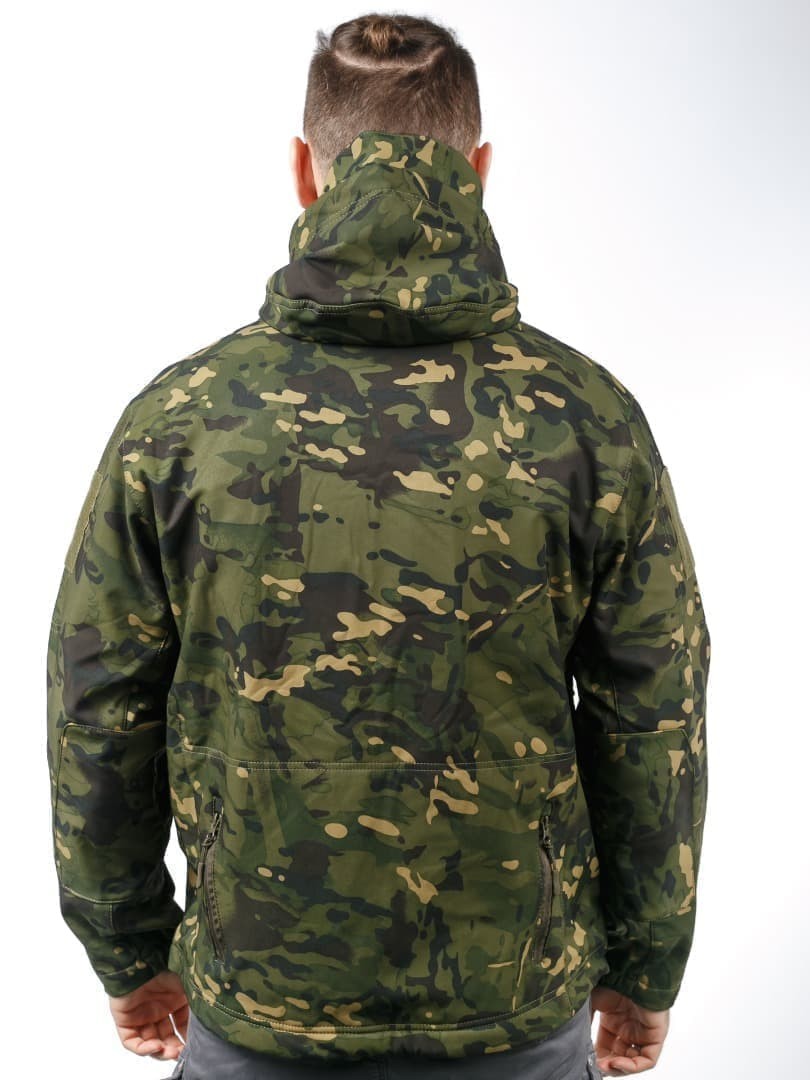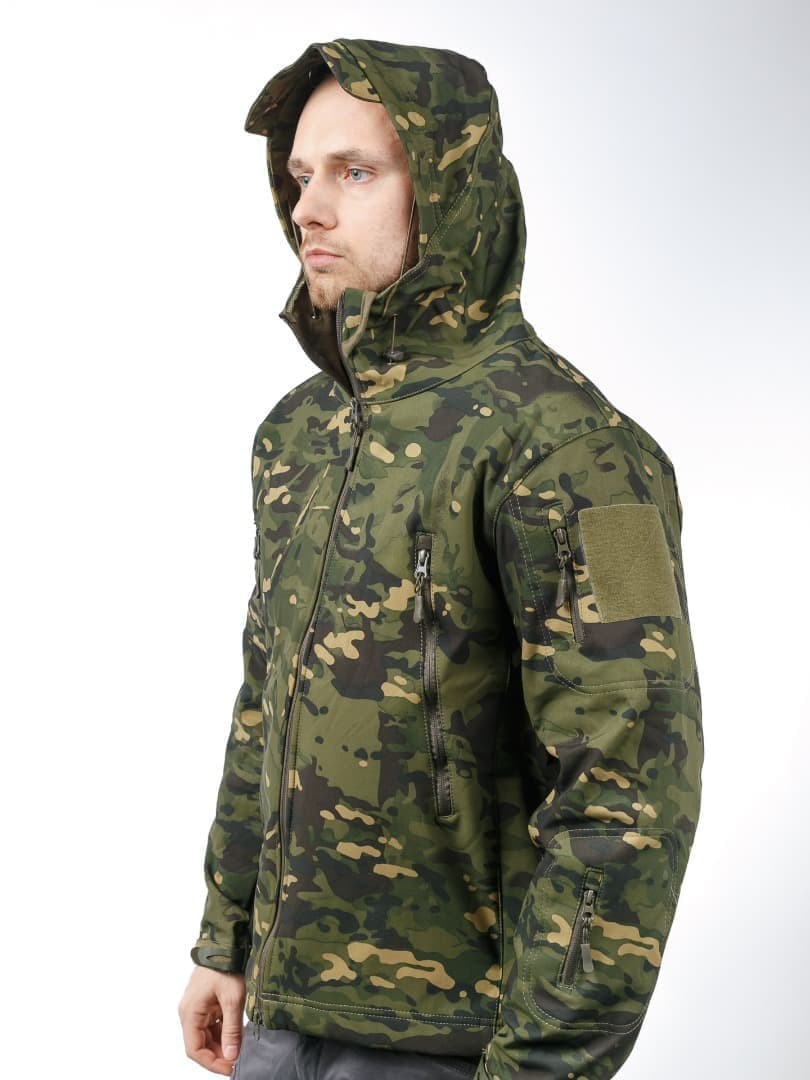 Куртка Shark Softshell, multicam dark камуфляж с тефлоновым покрытием, водоотталкивающая, с подкладкой из толстого флиса, с ветрозащитными молниями, прорезями под мышками для работников силовых структур и военных. а также для охоты, рыбалки, туризма и тактических игр.