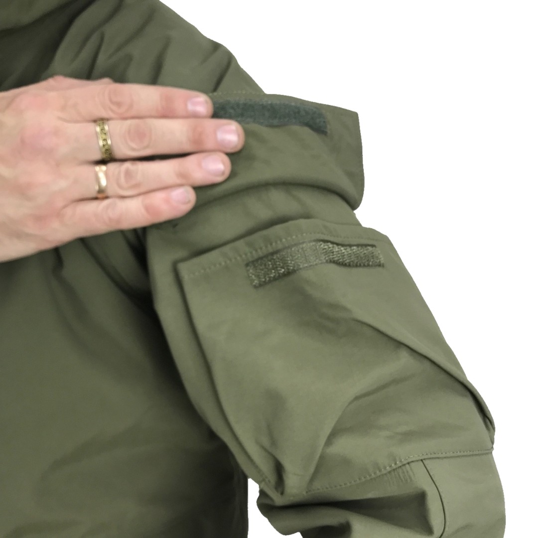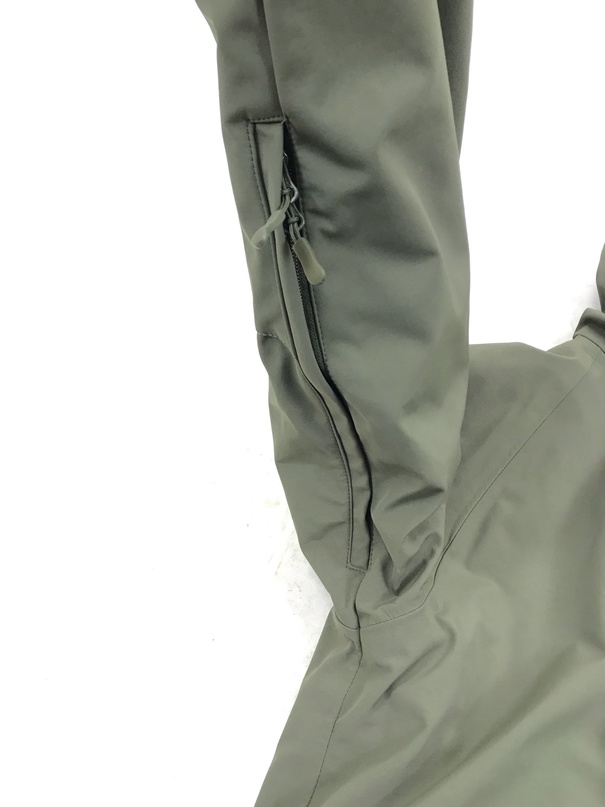 Куртка оснащена двумя передними карманами, которые дополнительно закрыты тканевыми клапанами, предотвращающими попадание воды внутрь. На правом рукаве расположен дополнительный карман на липучке, который удобно использовать для хранения мелких предметов.