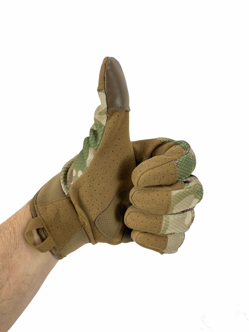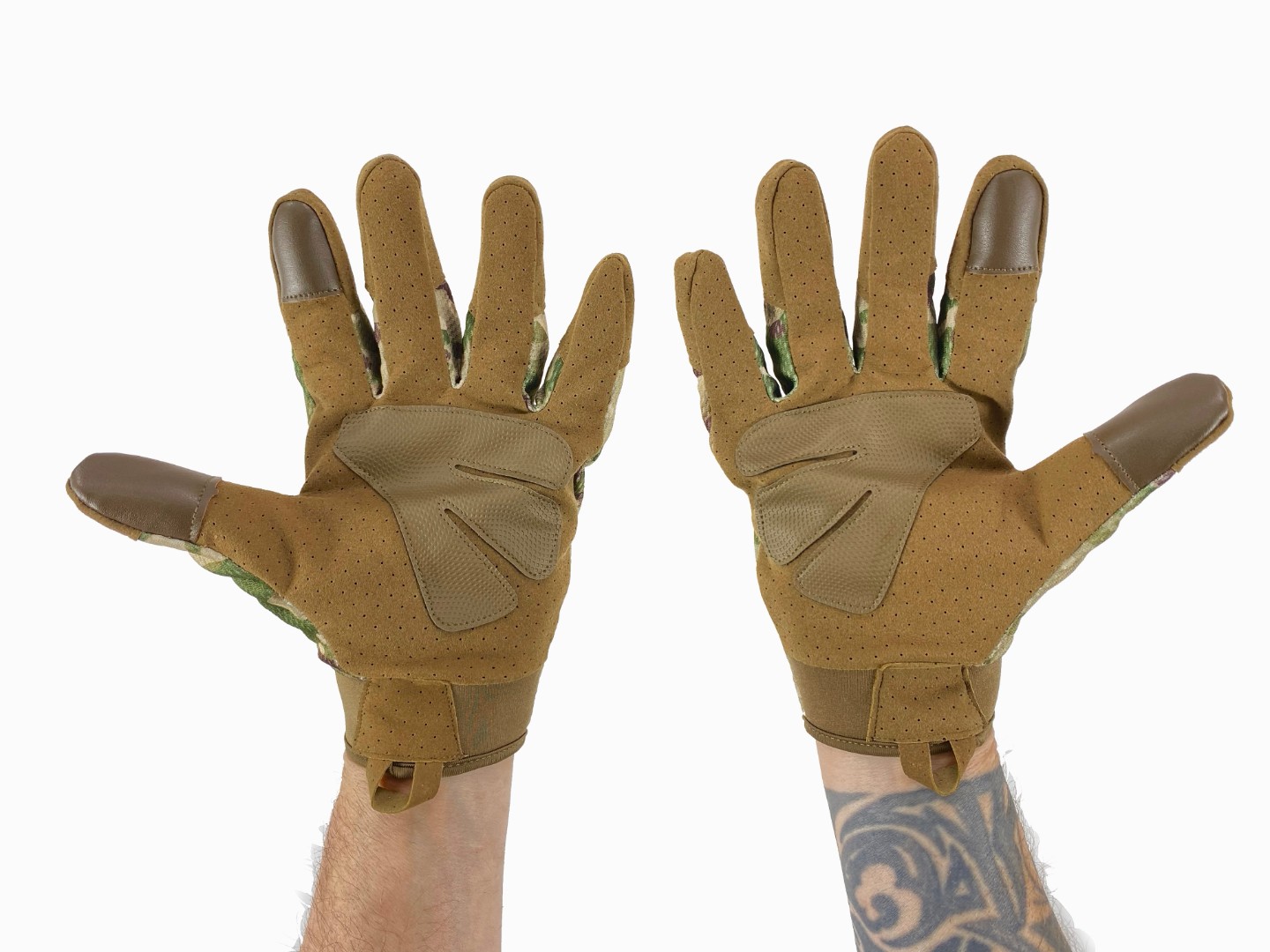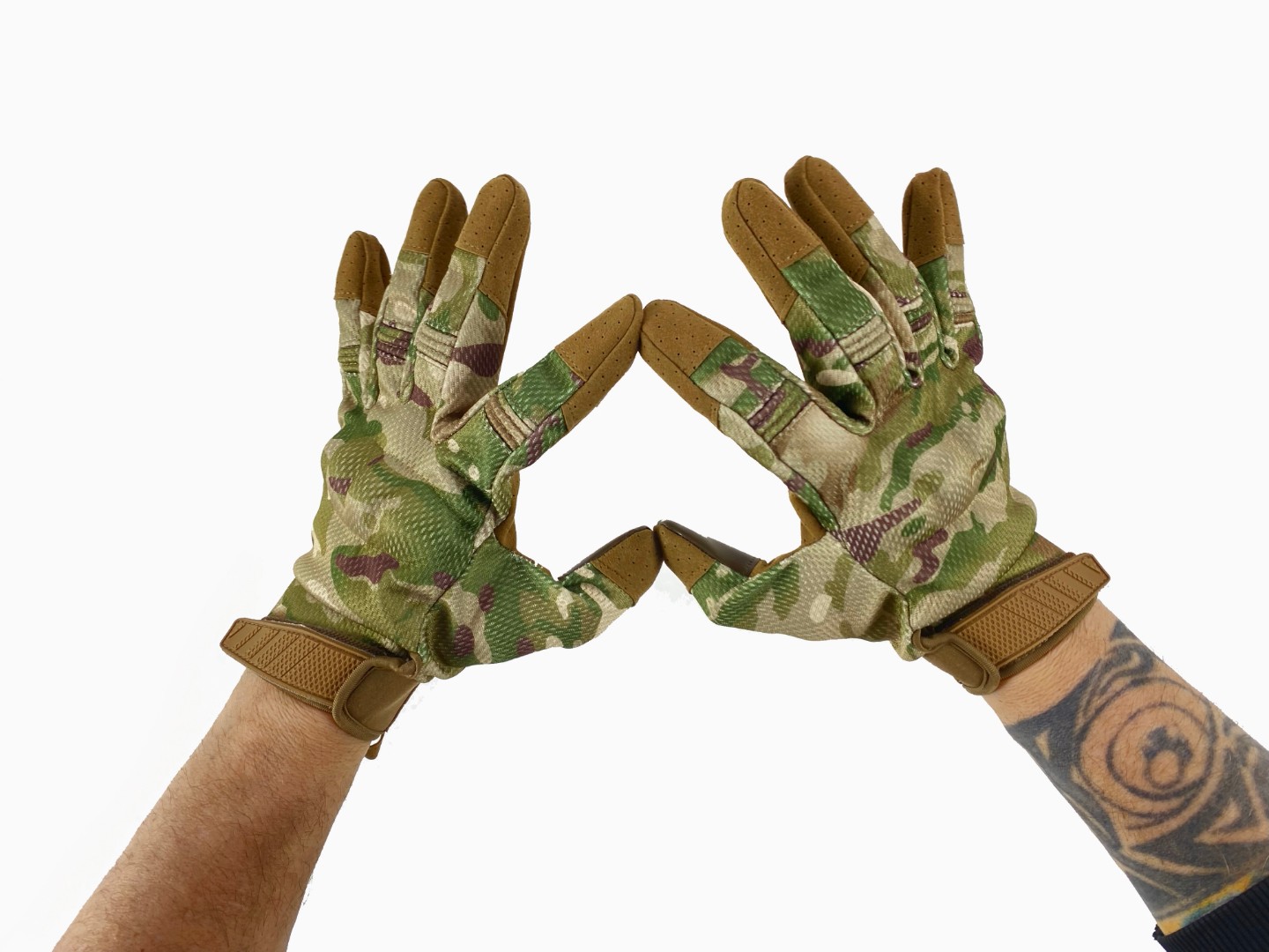 Тактические перчатки выполнены из перфрорированной ткани,что позволяет перчаткам вентилировать воздух.Ладони дополнительно усилены тканью для повышения износостойкости.Вшитые,пластиковые накладки на внешней стороне защищают кости от повреждений.Для удобного снятия/одевания перчатки предусмотрены липучки велкро.Тканевые петли позволяют пристёгивать перчатки к карабину,предотвращая потерю перчаток.
