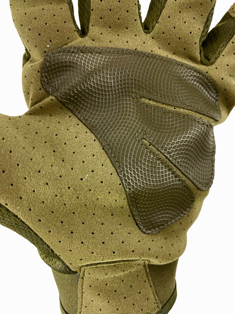 Тактические перчатки выполнены из перфрорированной ткани,что позволяет перчаткам вентилировать воздух.Ладони дополнительно усилены тканью для повышения износостойкости.Вшитые,пластиковые накладки на внешней стороне защищают кости от повреждений.Для удобного снятия/одевания перчатки предусмотрены липучки велкро.Тканевые петли позволяют пристёгивать перчатки к карабину,предотвращая потерю перчаток.