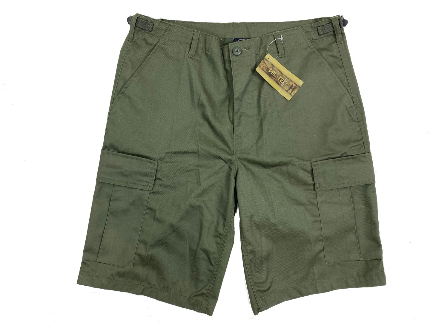 Шорты от Немецкой фирмы Mil-Tec выполнены из смесовой ткани.По бокам на поясе расположены утяжки для регулировки, размера.На шортах расположены шесть карманов:два кармана на поясе,два задних кармана на пуговицах и прикрытых тканью,два боковых накладных кармана на пуговицах.
