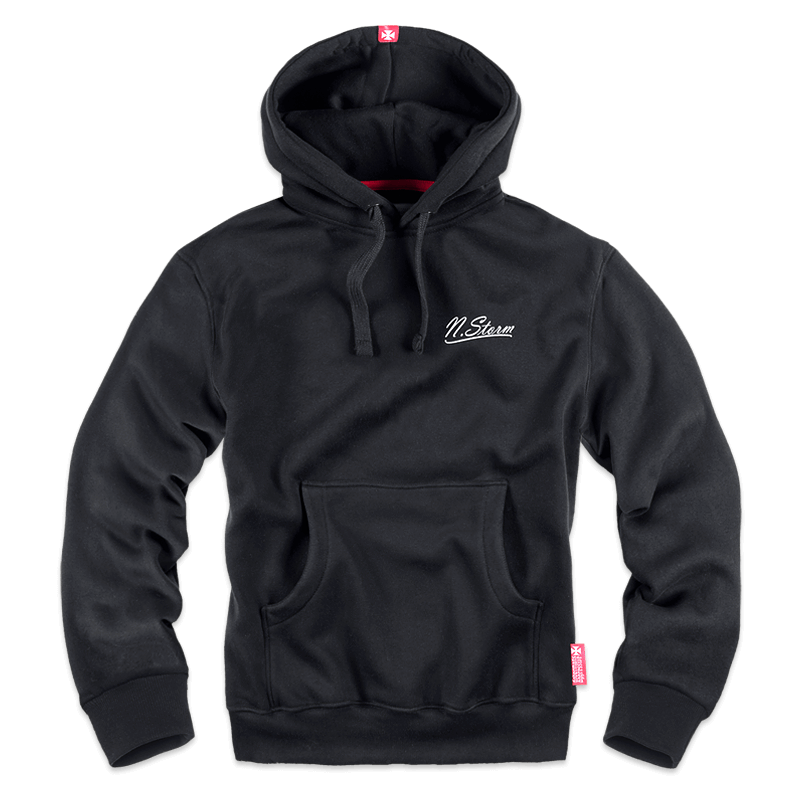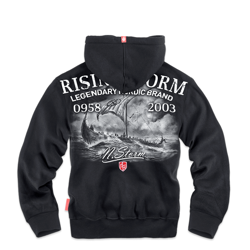 Хлопчатобумажная толстовка типа кенгуру. Модель, надеваемая через голову, обработана прочной трикотажной резинкой. Имеет накладной карман и капюшон со шнурком и металлическими ограничительными кольцами. Сзади однотонный принт из коллекции Vikings и двухцветная вышивная нашивка с руническими символами. Графика с изображением драккара на бушующем море. На высоте лопаток - большая надпись Rising Storm, ниже - приписка Legendary Nordic Brand а также два числа: 0958 и 2003. Передняя сторона толстовки декорирована небольшим логотипом N.Storm.