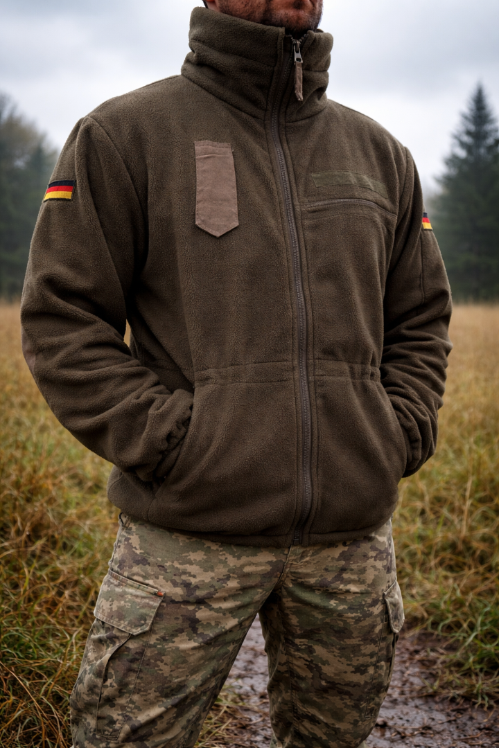 Флисовая куртка Bundeswehr — это профессиональный армейский утепляющий слой, созданный для холодной, ветреной и влажной погоды. Изготовленная из плотного высококачественного флиса, она обеспечивает отличную теплоизоляцию, мягкость, долговечность и комфорт в любых условиях — от городской среды до полевых задач. Куртка выполнена из тёплого премиального флиса: плотного, мягкого и дышащего материала, который быстро согревает, удерживает тепло и эффективно выводит влагу во время активности. Армейская функциональность выражена в наличии двух внешних скошенных карманов на молнии и одного внутреннего кармана для документов или телефона, при этом их расположение удобно даже при работе в перчатках. Высокий воротник полностью закрывает шею, низ на резинке защищает от поддувания, а манжеты с эластичными вставками и прорезями под большой палец сохраняют тепло и фиксируют рукав. Плечи и локти усилены износостойкими накладками, что делает куртку долговечной и пригодной для интенсивного использования в походах, на стрельбах, тренировках и при активном отдыхе. Анатомичный крой не стесняет движений, а регулировки в области талии и горла позволяют подстроить куртку под тело. Модель универсальна: её можно носить как самостоятельную верхнюю одежду в прохладную погоду или использовать как утепляющий слой под мембрану, парку или тактическую куртку зимой. Куртка идеально подходит для охоты, рыбалки, туризма, трекинга, страйкбола, стрелковых тренировок, службы и повседневного ношения, а также для тех, кто ищет тёплый, функциональный и надёжный флисовый слой.