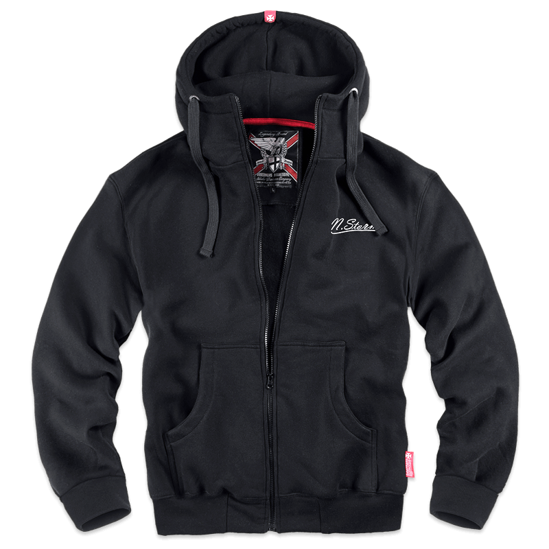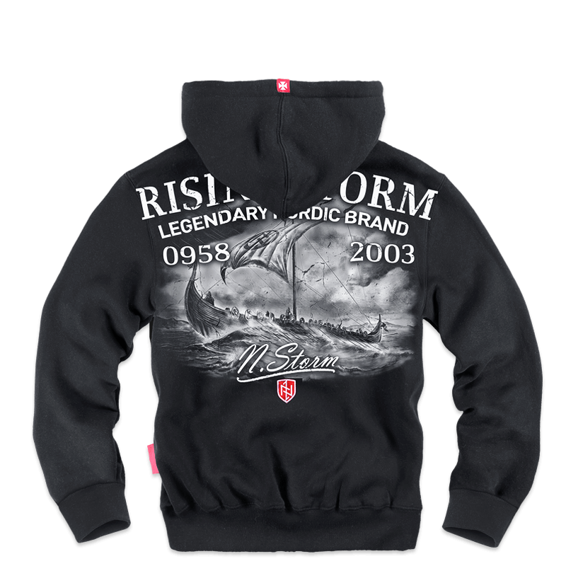 Мужская толстовка с принтом в скандинавском стиле. На спине однотонный принт больших размеров. Картинка с изображением корабля викингов на бушующем море, надписи Rising Storm и Legendary Nordic Brand, а также числа: 0958 и 2003. Ниже логотип N.Storm, который, размером поменьше повторяется также и на передней стороне толстовки, а также двухцветная аппликация в виде щита с вышивными руническими знаками. Модель из коллекции Vikings, изготовлена из хлопчатобумажной ткани высокой плотности 320 г., застегивается высоко под шею, обработана широкими трикотажными резинками. Спереди - два накладных кармана. В капюшоне шнурок, металлические ограничительные кольца и красный лейбл.