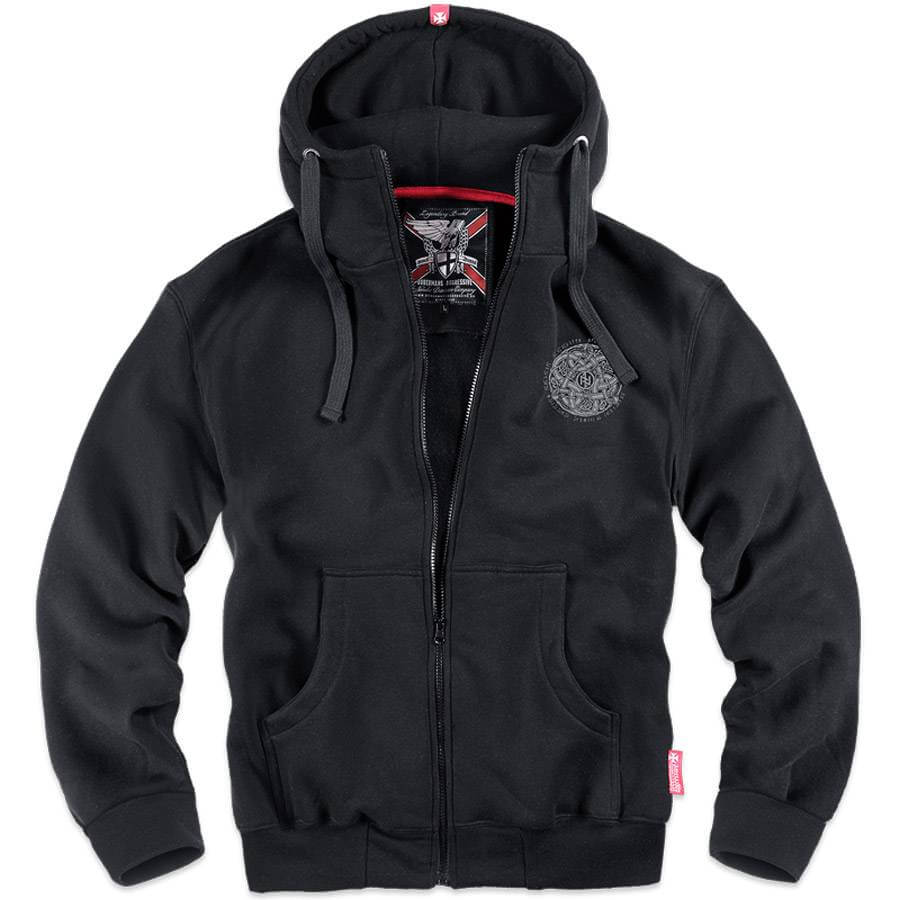 Хлопчатобумажная толстовка с молнией, капюшоном и двумя накладными карманами. Классическая модель, отделанная прочными трикотажными резинками. Имеет высокую стойку. У капюшона — шнурки и металлические кольца. Красные акценты в виде двух лейблов с логотипом марки, внутреннего плиссе и ярлыка с мотивом орла. На левой груди — небольшая, одноцветная графика в скандинавском стиле. Рисунок с мотивом нордических драконов, представляющий кельтские сплетения и рунические знаки. Сзади — такой же принт большего размера.