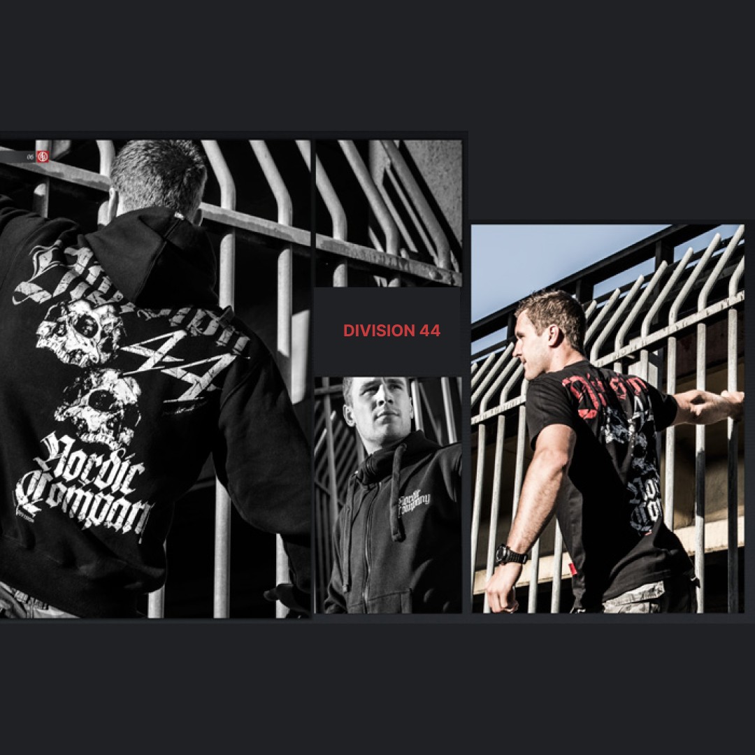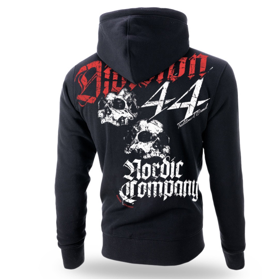 Классическая мужская толстовка на молнии ADS, изготовлена из качественной хлопчатобумажной ткани плотностью 320г/м². Имеет два накладных кармана, высокий воротник и капюшон, у шнурков - металлические кольца. Низ толстовки и рукава обработаны широкой трикотажной резинкой. У капюшона шнурки и металлические стопорные кольца. На задней стороне толстовки рисунок покрывающий почти всю спину. На плечах большой принт с надписью Division 44 проходящий через швы рукавов. В центре - два черепа, а ниже надпись Nordic Division. Надписи выполнены готическим шрифтом. На левой стороне груди однотонная вышивка Nordic Company. Двухцветный принт с эффектом потертости.