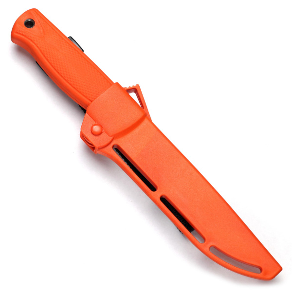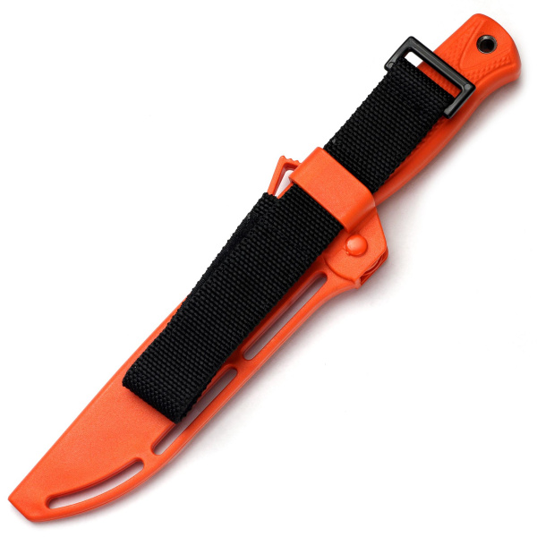 Ножны оснащены фирменной роликовой системой запирания — фиксация клинка надёжная, нож при ношении не болтается.