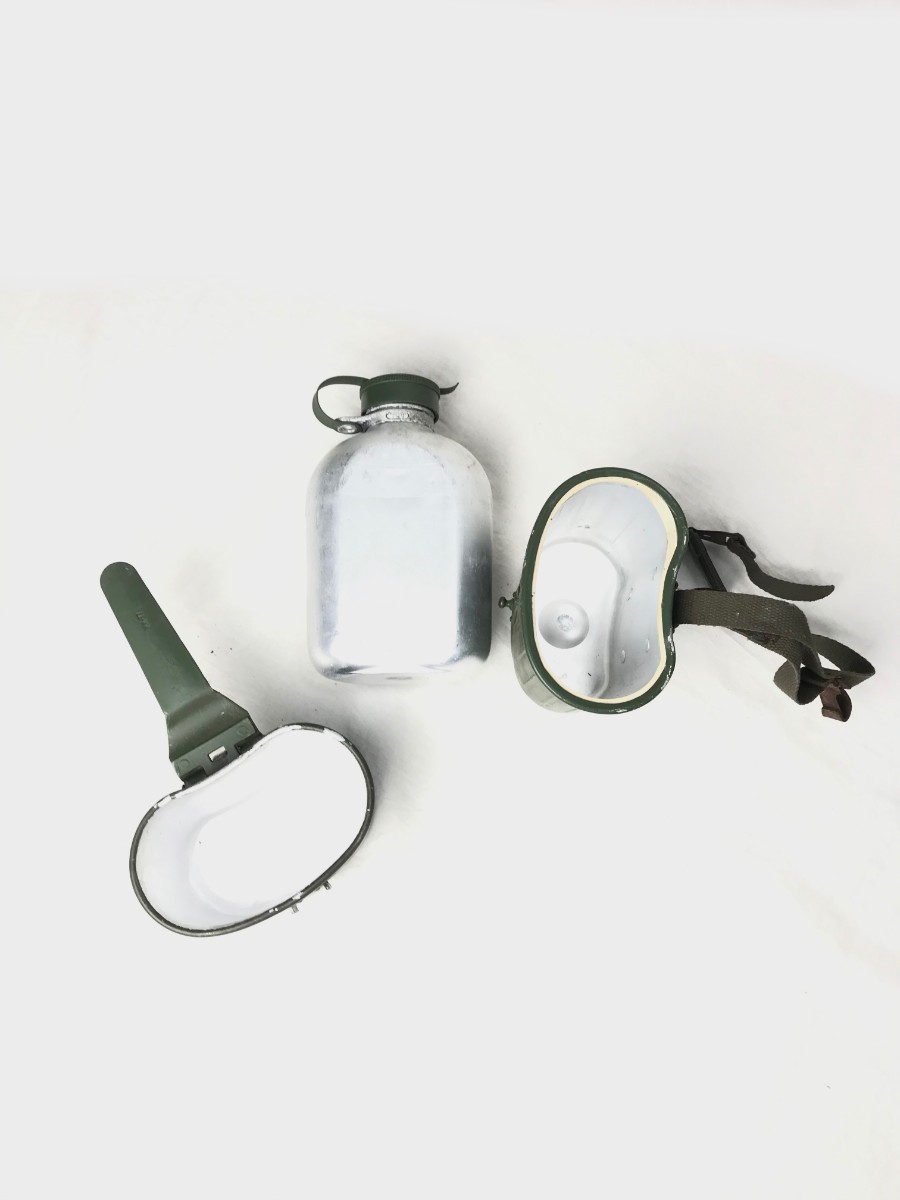 Состоит из котелка, который делится на 2 части - миску (0,6 л) и кружку (0,65 л), и самой фляги объемом 0,8л. Все предметы собираются в единый котелок и затягиваются ремешком. С помощью кожаного ремешка или карабина на задней стороне фляги ее можно вешать на ремень. Материал - алюминий. Состояние БУ, нормальное,могут быть небольшие царапины.