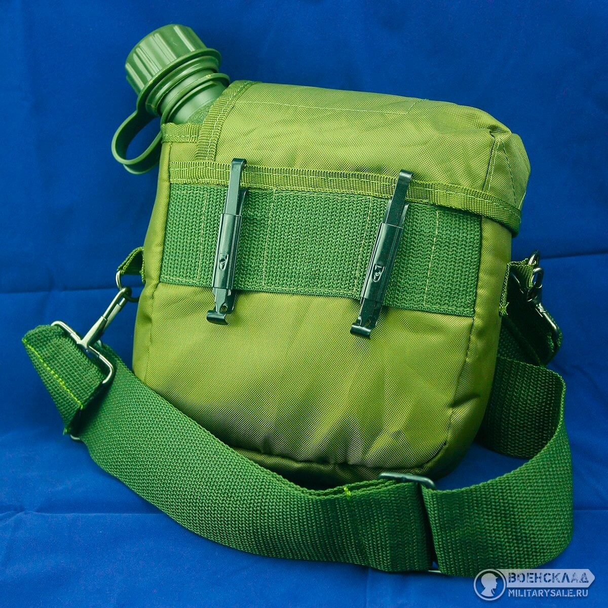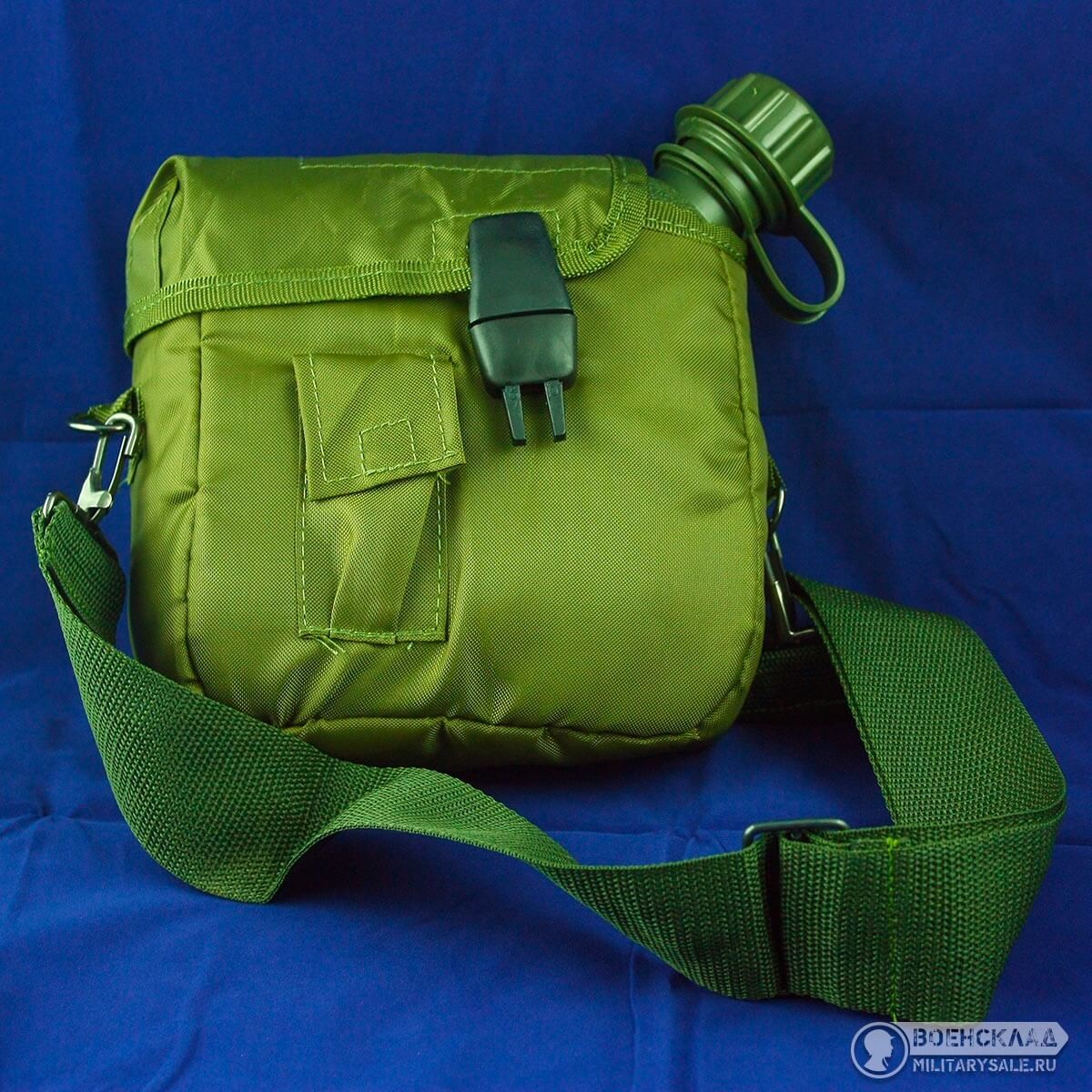 Оливковый нейлоновый подсумок-чехол военного образца для двухквартовой фляги c регулируемым плечевым ремнем.