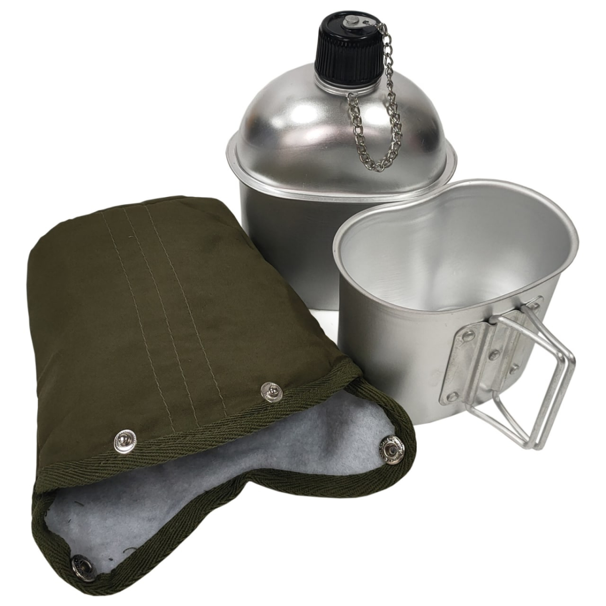 В набор входит: металлическая фляга объёмом 1 литр, котелок с крышкой и удобный армейский чехол с креплением на ремень или снаряжение.
