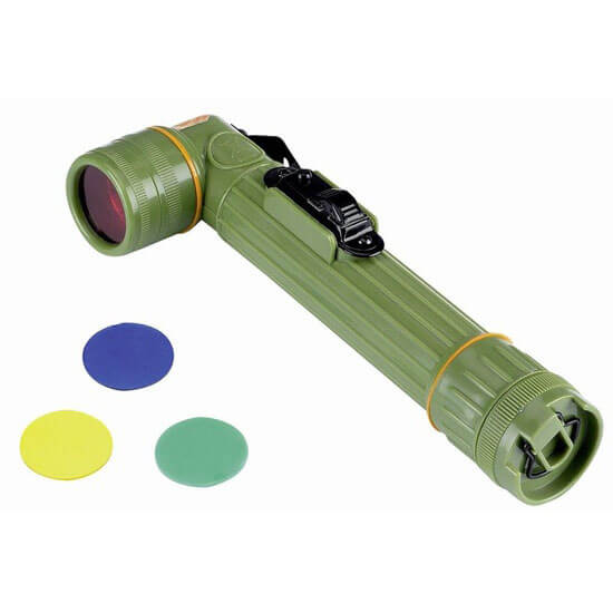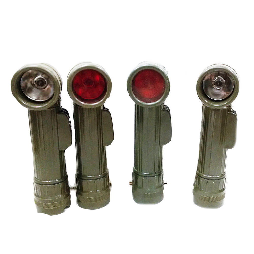 Г-образный фонарь DX-991/U в. Прочный корпус DX-991/U из ударопрочного пластика герметичен, не пропускает воду и пыль, а матовая поверхность не бликует. В комплекте идет запасная лампочка и два светофильтра (для подачи сигналов, хранятся в специальном отсеке). Переключатель защищен щитками от самопроизвольного включения и имеет несколько режимов: вкл, выкл, мигание. Можно подавать сигналы азбукой Морзе. Г-образная фома предусмотрена с целью освобождения рук солдата (фонарь можно повесить на грудь или плечо с помощью клипсы)