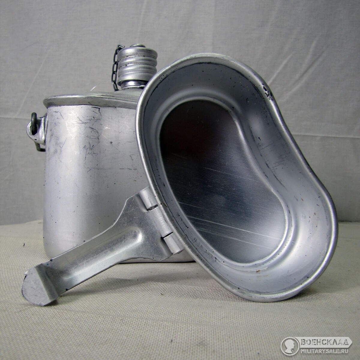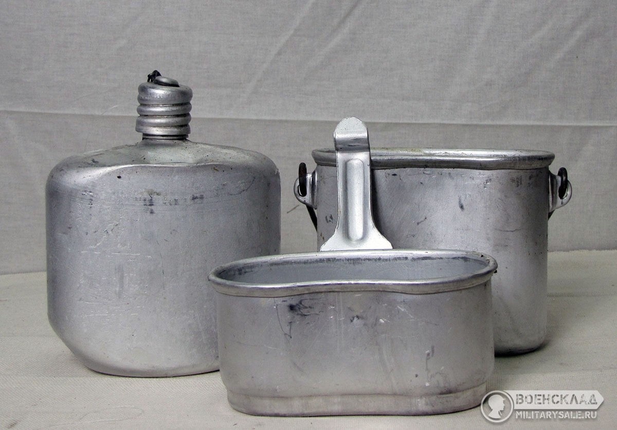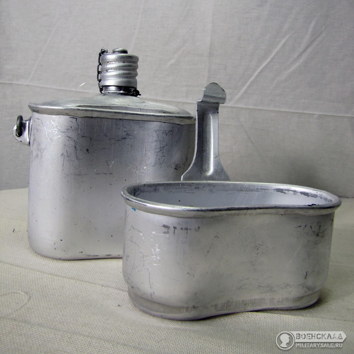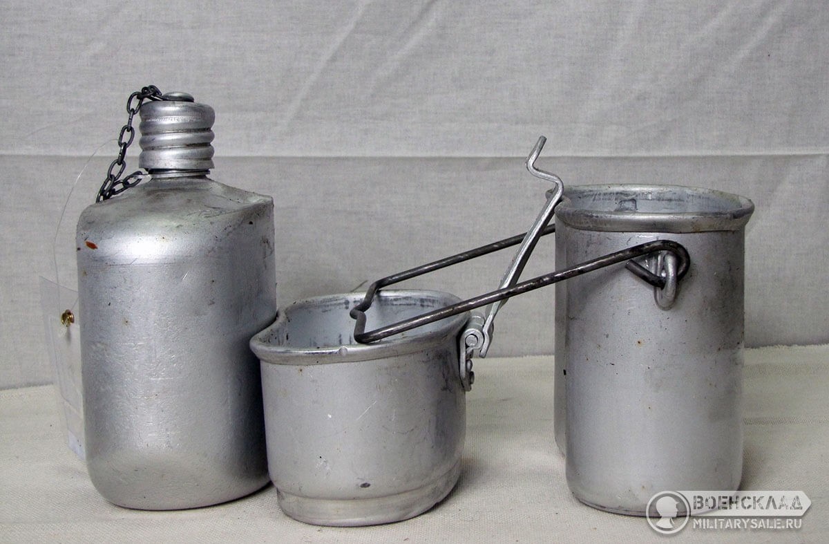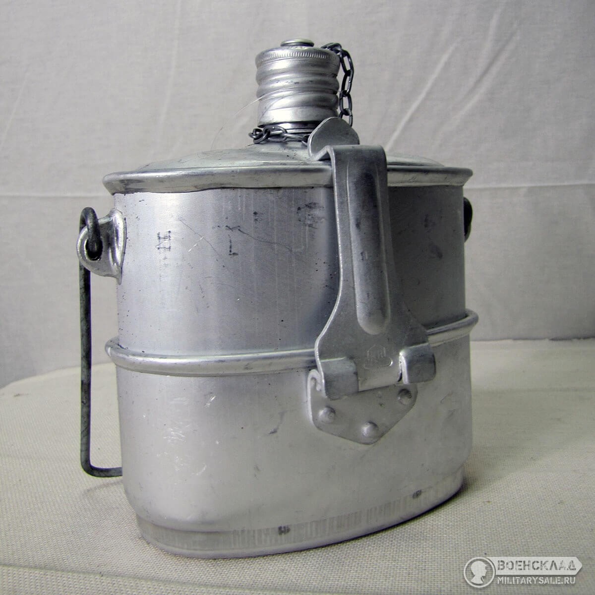 Фляга емкостью 1 литр внешне повторяющая внутренние габариты котелка. Материал – алюминий. Масса– 220 гр. В более поздних модификациях комплекта флягу стали делать пластиковую.