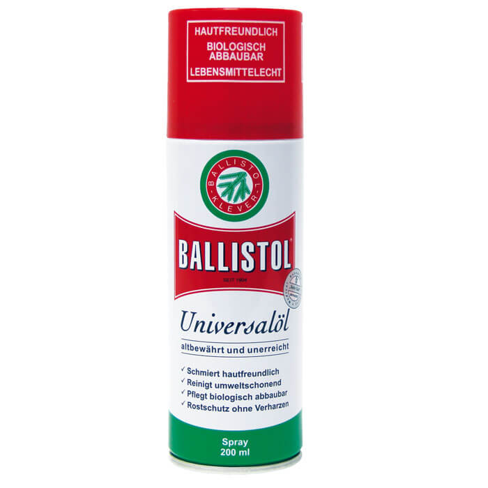 Универсальное оружейное масло Ballistol удаляет отвердения и налёты свинца, меди и томпака со стволов, патронников и других металлических частей огнестрельного оружия, изолирует и защищает деревянные части оружия, очищает, размягчает и пропитывает кобуры, лямки, ремни.