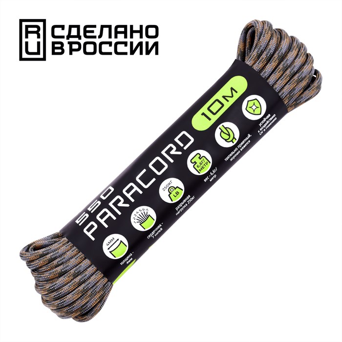 Паракорд 550 CORD в камуфляжной расцветке "wetland" длиной 10 метров представляет собой прочный и надежный шнур, способный выдерживать до 250 кг. Изготовлен из высококачественного нейлона и включает 7 внутренних нитей, которые можно использовать отдельно при необходимости. Идеально подходит для тактического использования, кемпинга, туризма и других активностей на природе. Этот паракорд незаменим для создания палаток, ловушек, креплений и в экстренных ситуациях. Его камуфляжная расцветка позволяет использовать шнур для маскировки и слияния с природной средой.