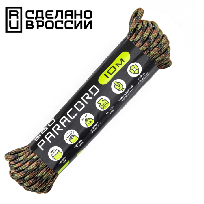 Паракорд 550 CORD в камуфляжной расцветке "Woodland" длиной 10 метров представляет собой прочный шнур, разработанный для высоких нагрузок до 250 кг. В его составе 7 внутренних нитей, которые можно использовать по отдельности при необходимости, что делает его незаменимым для кемпинга, охоты, туризма и любых тактических задач. Камуфляжный рисунок "Woodland" позволяет эффективно маскировать снаряжение и сливается с природной средой. Этот паракорд подходит для создания ловушек, палаток и других конструкций на природе.