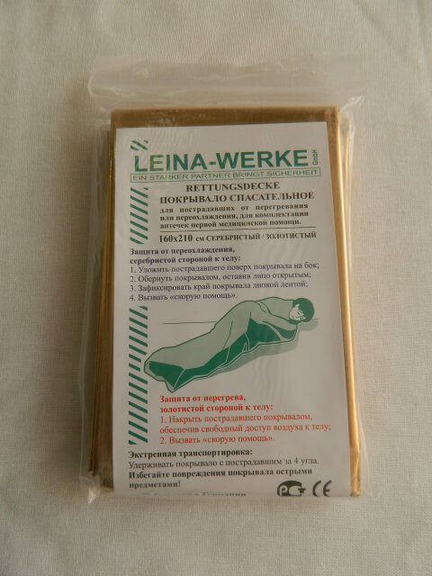 Покрывало спасательное производства фирмы "LEINA WERKE" GmbH, Германия, представляет собой полиэфирную пленку с напылением металла серебристого и золотистого цвета с разных сторон.