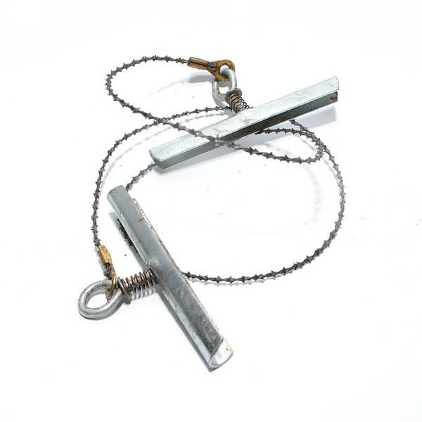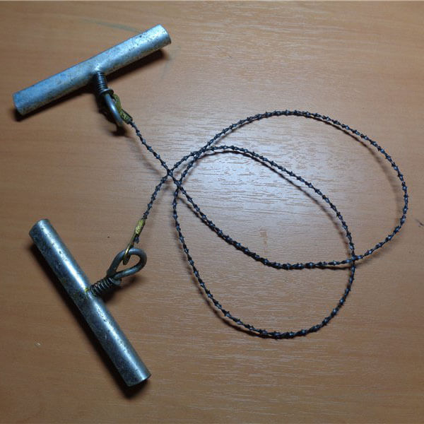 Карманная пила изготовлена из цельного полотна для распила. Также имеются две металлические ручки из нержавеющей стали, к которым крепятся специальные петли. При помощи наконечников полотно пилы соединяется к петлям ручек. Хранится она в специальном чехле, что позволяет носить ее с собой даже в кармане униформы.