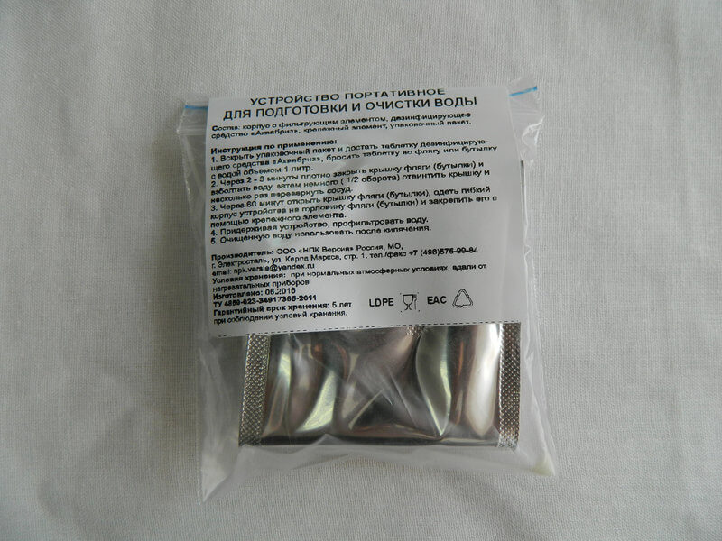 Устройство предназначено для подготовки, очистки и дезинфекции воды и других жидкостей, взятых из природных источников в полевых условиях от механических примесей и посторонних запахов. Устройство очень просто и удобно в эксплуатации, имеет маленький вес и размеры, уместиться даже в кармане.