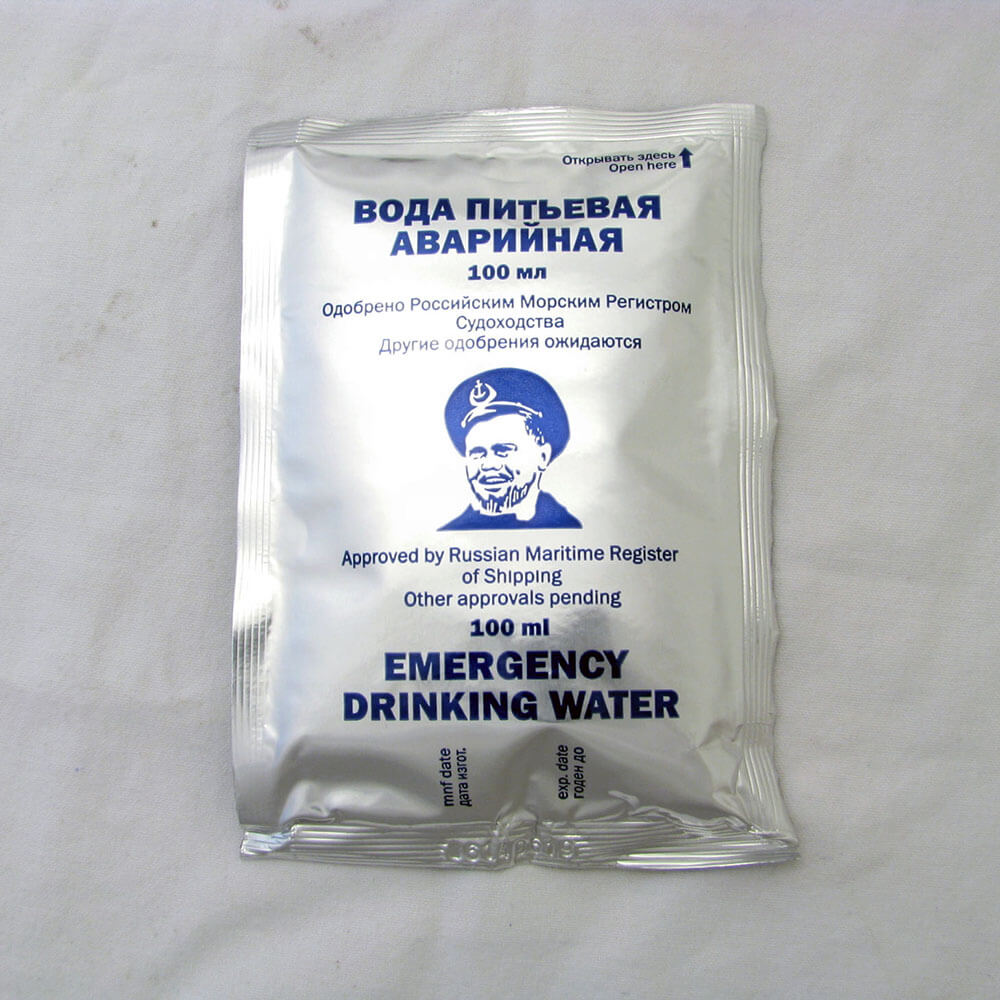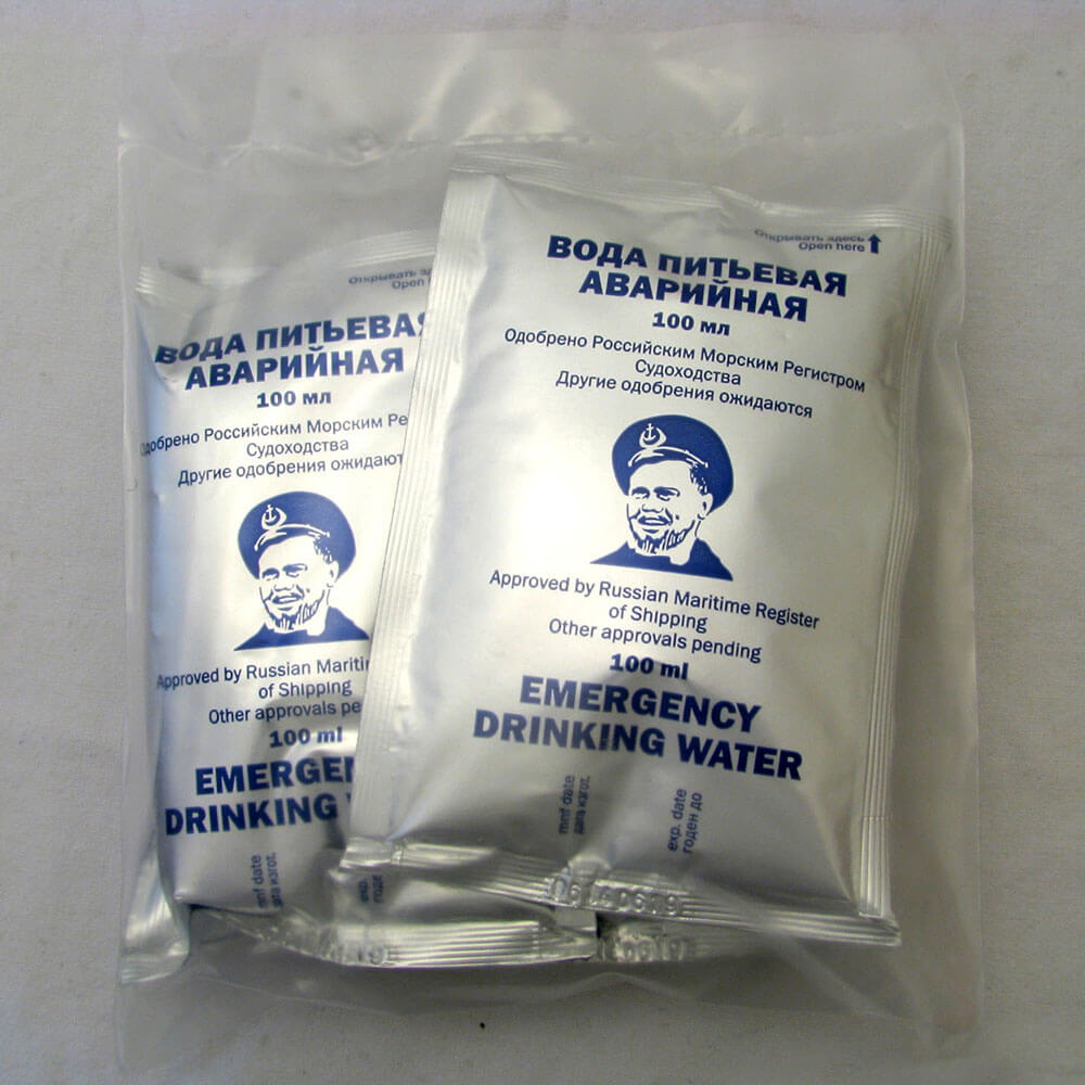 Согласно правилам выживания на море, первые сутки после наступления чрезвычайной ситуации воду употреблять не рекомендуется, в последующем норма потребления не должна превышать 0,5 литра (5 пакетов) в сутки на человека. Для удобства соблюдения этих правил, 100мл. пакеты упакованы в полиэтилен по 5шт. (всего 500мл) - это как раз и есть рекомендованная суточная норма.