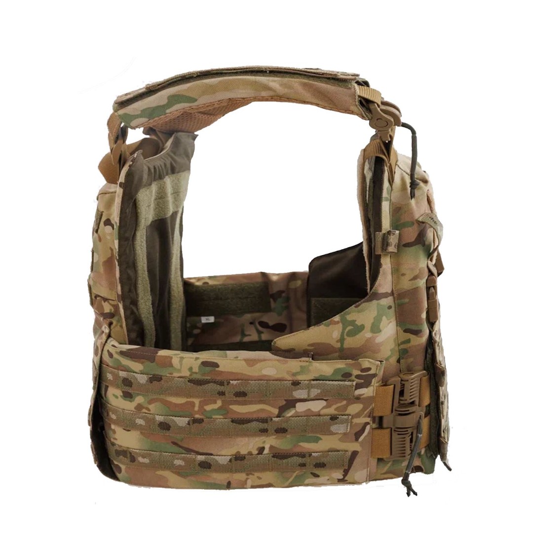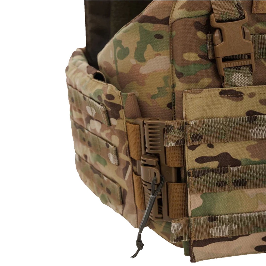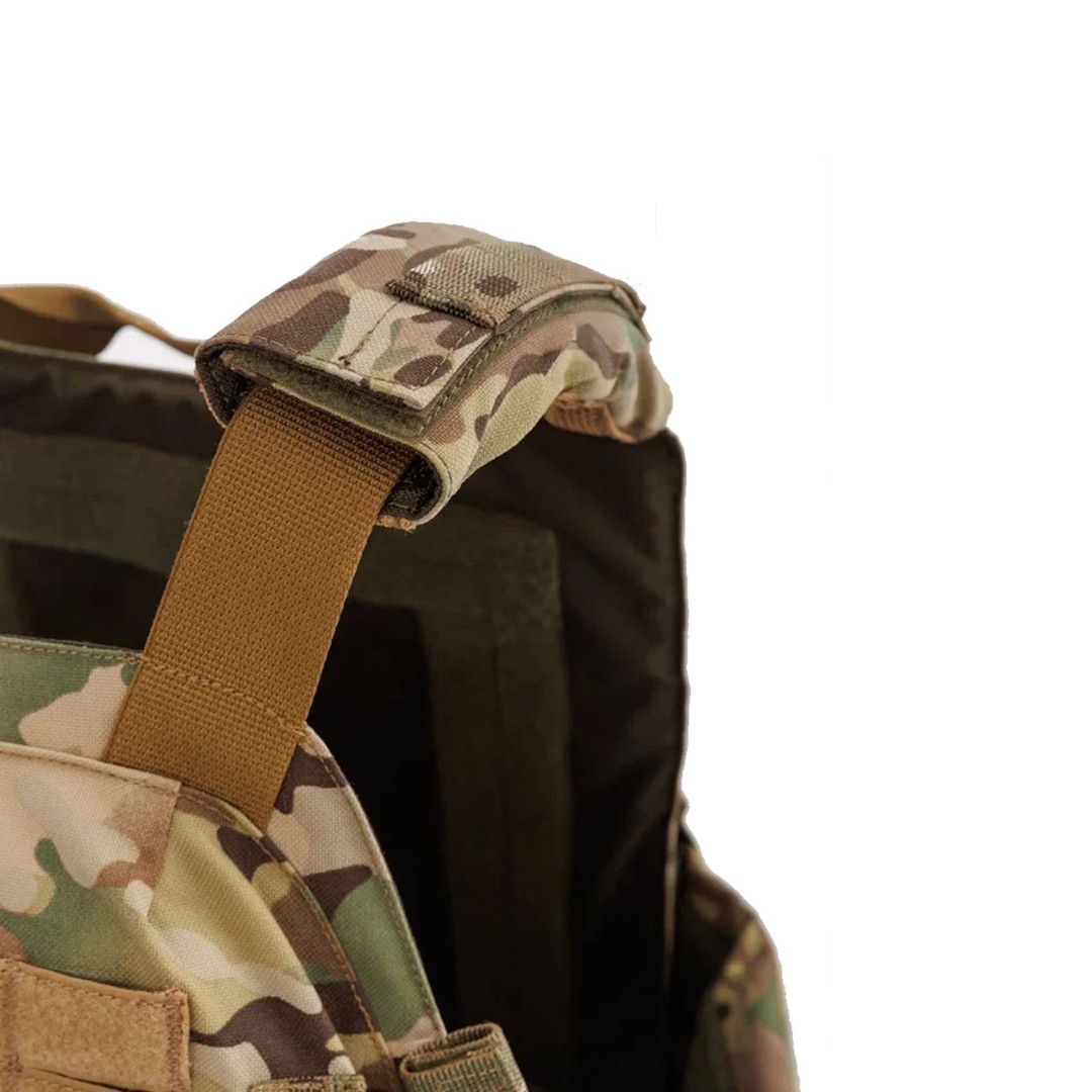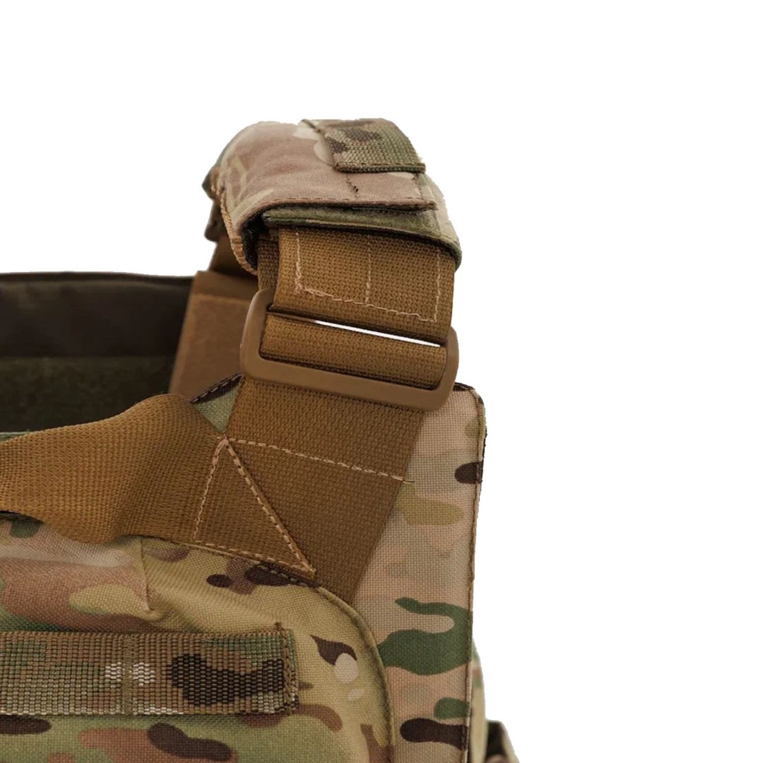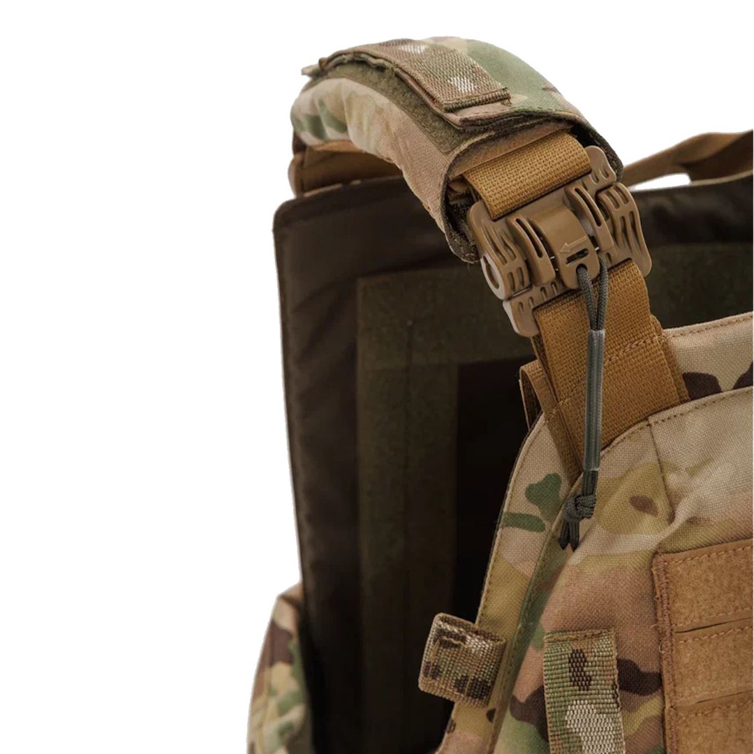 На внутренней стороне бронежилета расположены демпферные каппы для гашения кинетической энергии, а на задней части плитника выполнена эвакуационная стропа. Стропы Molle расположены по всему периметру: по бокам, сзади и спереди. Каждый угол тщательно продуман и скруглён — никакого дискомфорта и натирания даже при длительных марш-бросках. Это бронежилет на все сезоны: широкий диапазон регулировок по плечам и талии позволяет носить его и на лёгкой форме, и поверх зимнего комплекта. Передняя панель увеличена — без уязвимых щелей. Даже при поломке основных сбросов вы останетесь под защитой — предусмотрены дополнительные элементы фиксации на плечах и камербандах.