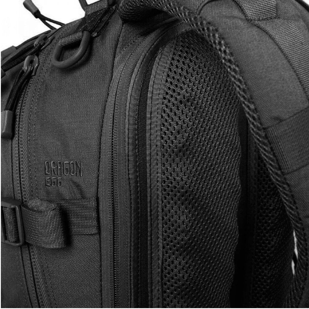 Дополнительные боковые карманы могут переносить небольшие и плоские предметы. Laser-cutted система совместима с MOLLE/PALS, это делает рюкзак не только полностью модульным, но также поддерживает низкий профиль рюкзака. Благодаря яйцевидной форме рюкзак имеет меньшую высоту и ширину, чем другие подобные рюкзаки, что делает его более комфортным и дает возможность носить в комплекте с разгрузками, тактическими ремнями или бронежилетами. Система подвески основана на удобных лямках и внутренних ребрах жесткости в спинке. Изготовлен из прочной 500D