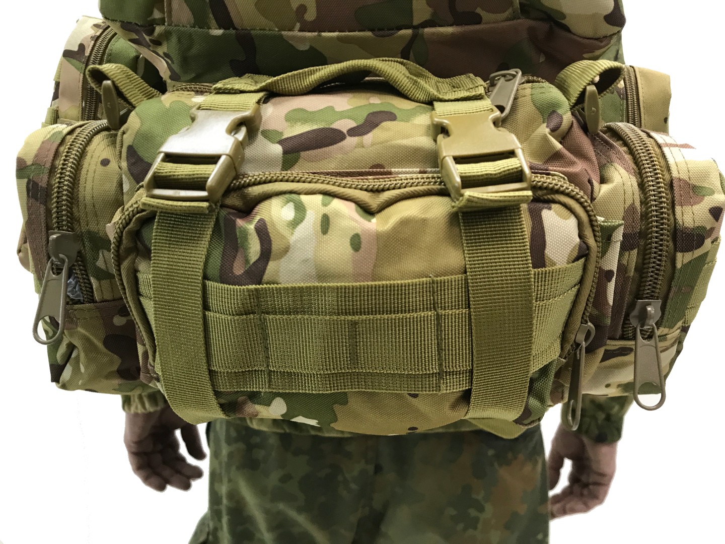 Подсумки закрепляются при помощи системы MOLLE,при необходимости легко снимаются,переставляются на боковую или заднюю часть рюкзака на стропы. Нижнюю сумку можно отстегнуть и носить на пояс при этом имеется оперативный доступ ко всем карманам на сумке.