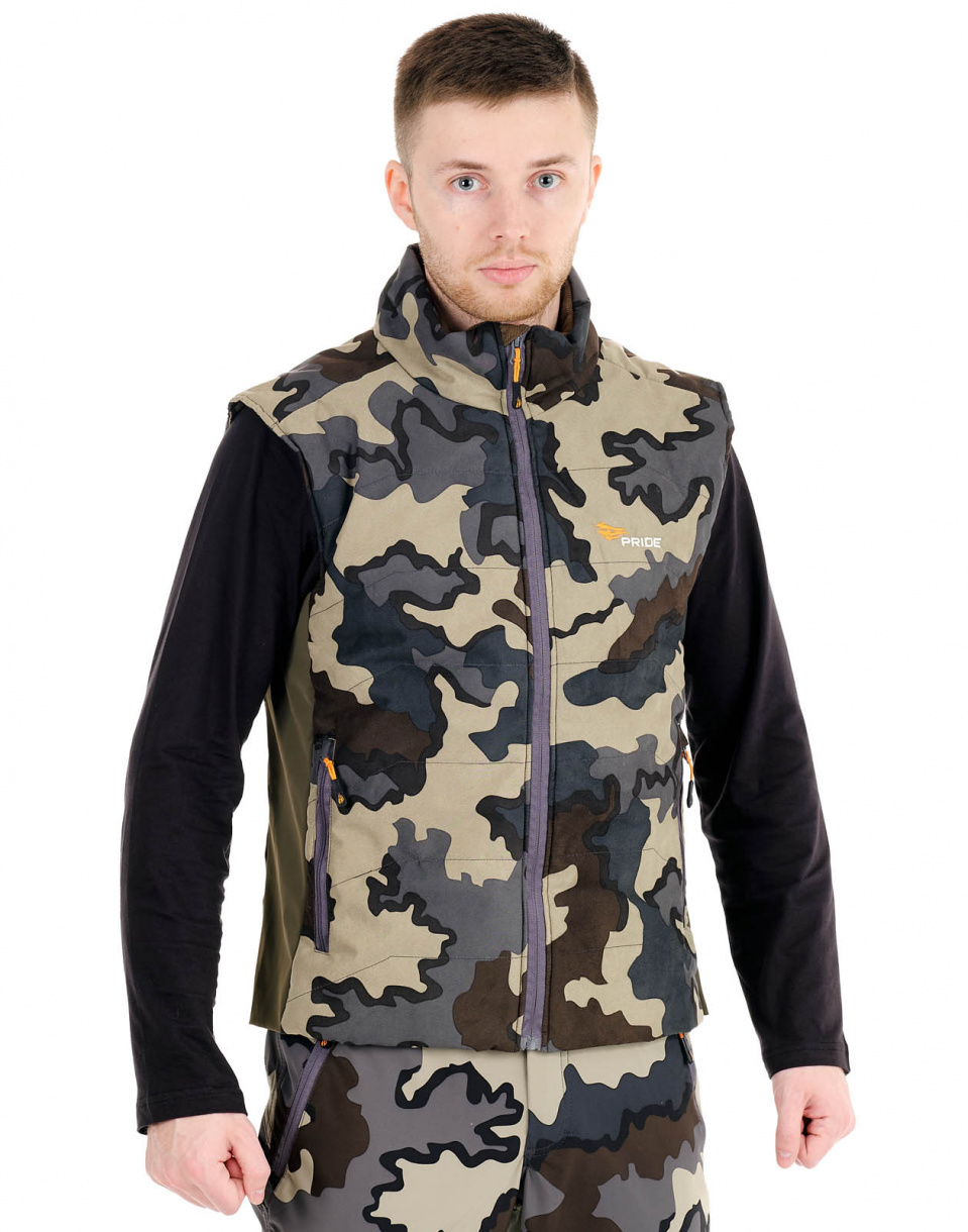 Утепленный жилет «Акела» из гидрофобной замши. Согреет на охоте прохладным летом, поздней весной и ранней осенью. По бокам имеются эластичные мембранные вставки для большего прилегания к телу. Полочки и спинка жилета утеплены. От порывов ветра защищает высокий воротник и ветрозащитная планка на основной молнии.