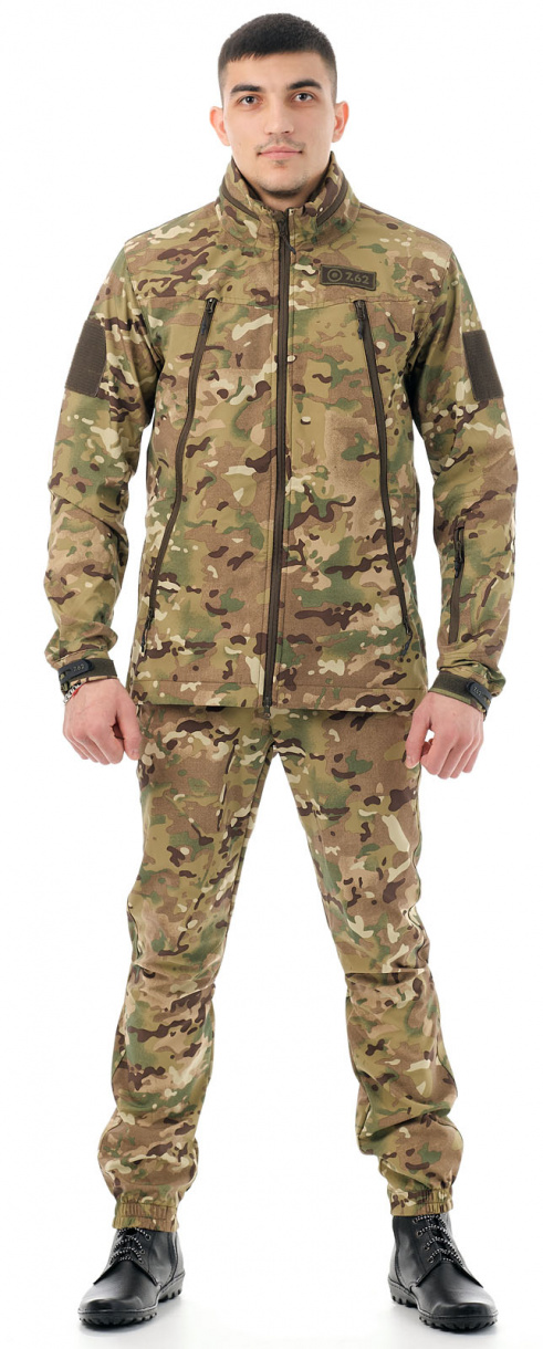 Костюм «Альфа» тактического направления (ТМ 7.62) из современного инновационного материала софт-шелл, представляющего собой единое полотно из трех слоев: трикотаж, мембрана, трикотаж. Такое сочетание обеспечивает защиту от порывов ветра и дождя, отличное влагоотведение, сохранение тепла. Само изделие при этом имеет небольшой вес (компактное) и эластичность (не стесняет движений). Тефлоновая обработка костюма позволяет каплям воды и загрязнений легко скатываться с поверхности, уменьшая таким образом количество стирок.