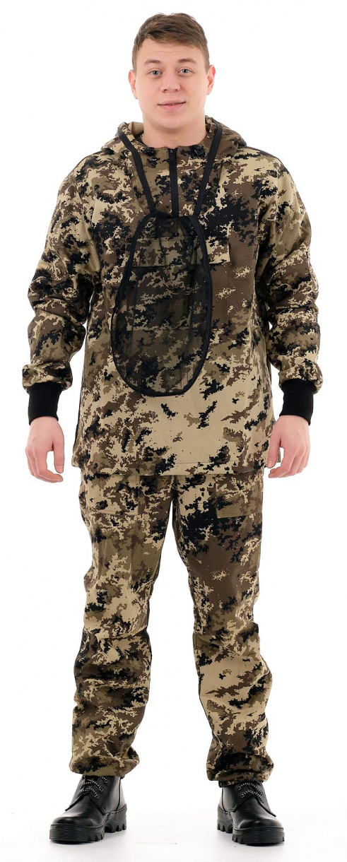 Сетка накомарника съемная и легко убирается в потайной карман. Плотная ткань создает надежную защиту, позволяет телу «дышать» и надежно защищает от насекомых. Рукава оснащены плотными трикотажными манжетами. Этот костюм отлично подойдет для всех, кто много бывает в лесу.